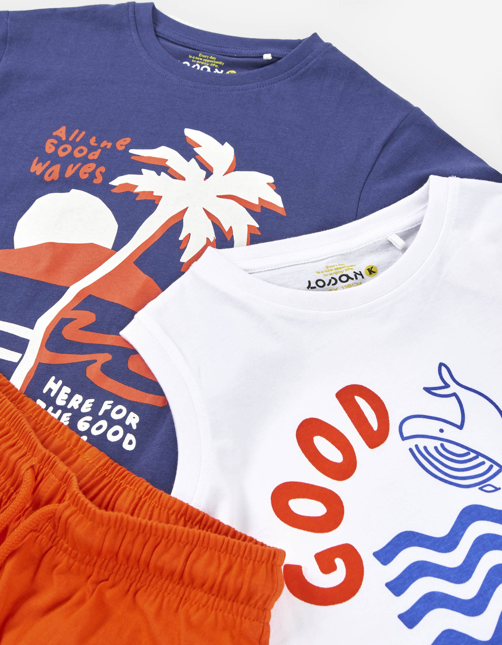 Completo tre pezzi per bambino, in jersey 100% cotone. Include due t-shirt, una blu scuro a maniche corte e una bianca senza maniche, entrambe con stampa frontale; e pantaloncini arancioni a tinta unita.
