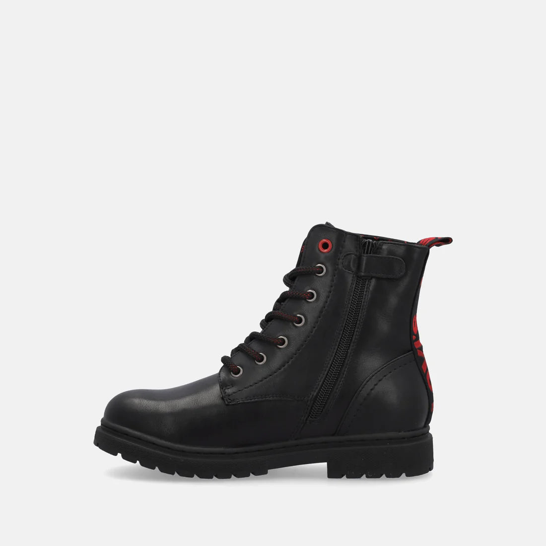 Dal design classico ma originale, sono caratterizzati da dettagli rossi il che non solo conferisce un look trendy ma aggiunge anche un tocco di brio al modello. Realizzati in morbida similpelle total black, sono dotati di una doppia chiusura che garantisce una calzata stabile ad ogni passo permettendo di esplorare in sicurezza. Perfetti con dei semplici blue jeans e una felpa per un look casual e grintoso, oppure con una gonna e una maglietta per uno stile rock ma femminile.