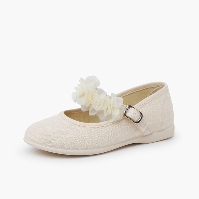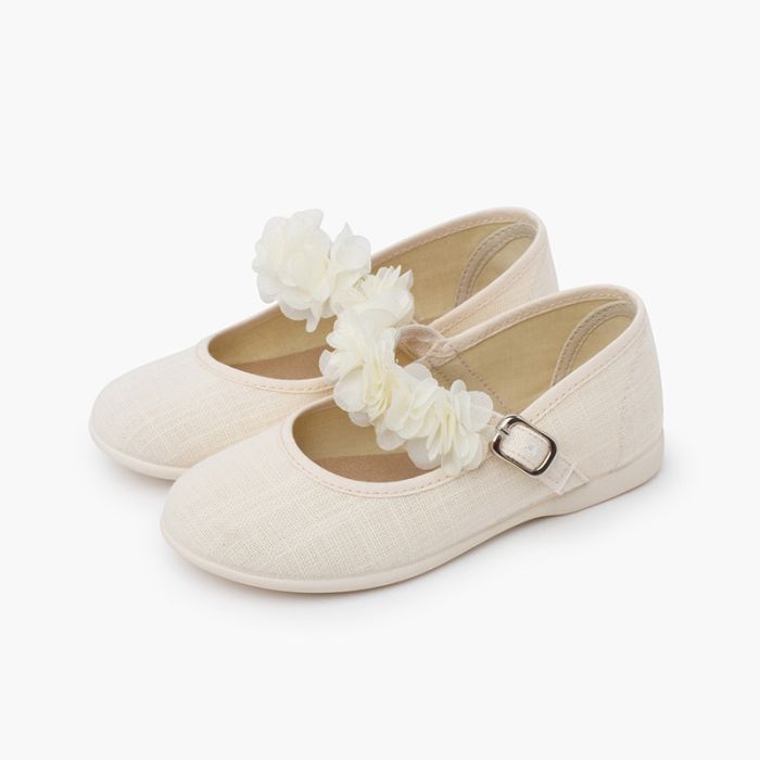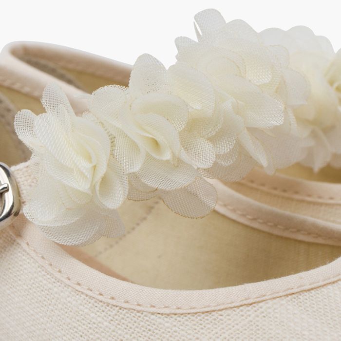 Queste bellissime ballerine in lino hanno un segreto: la decorazione floreale dello stesso colore della scarpa e con un effetto a metà tra il tulle e lo chiffon si può mettere e togliere!