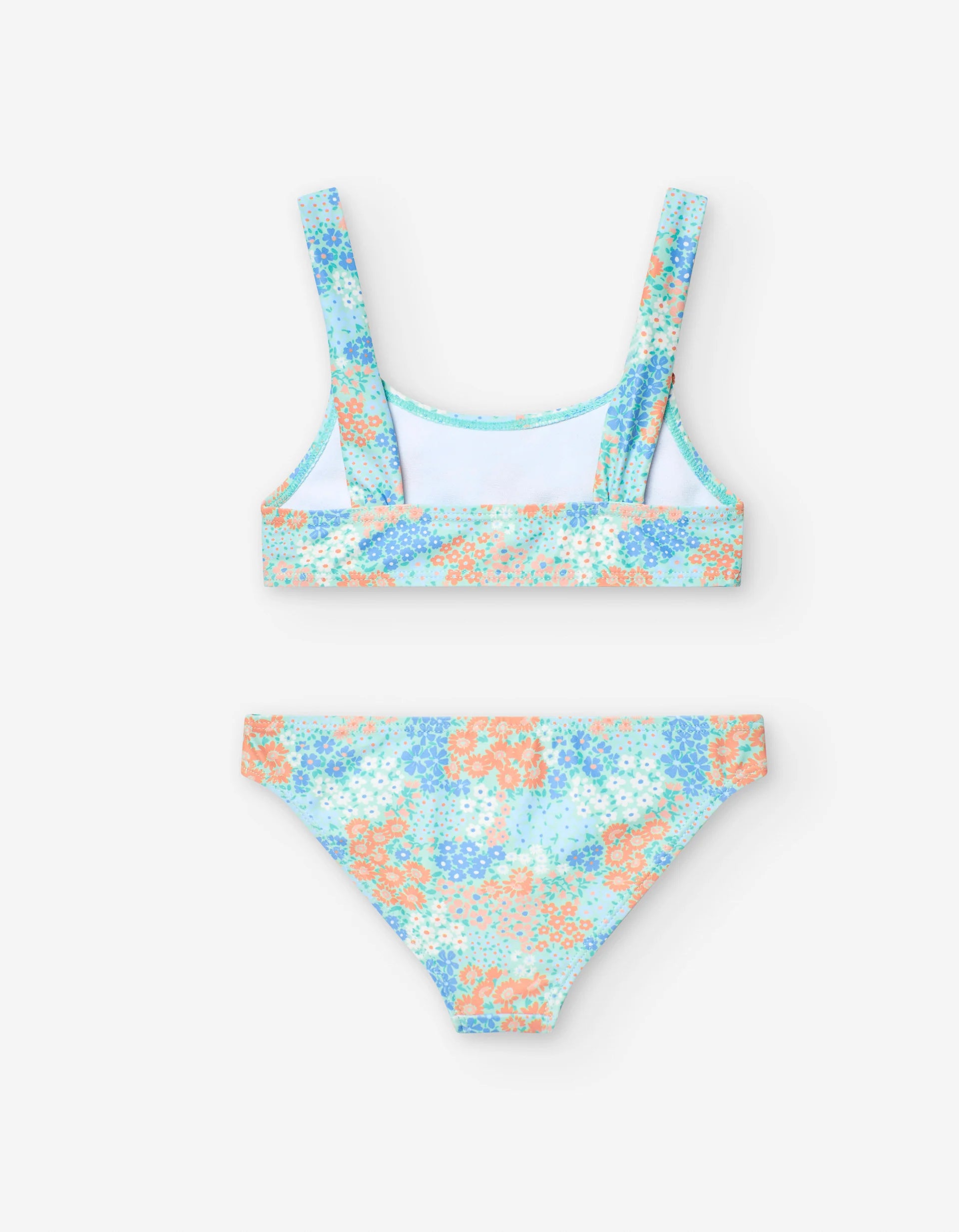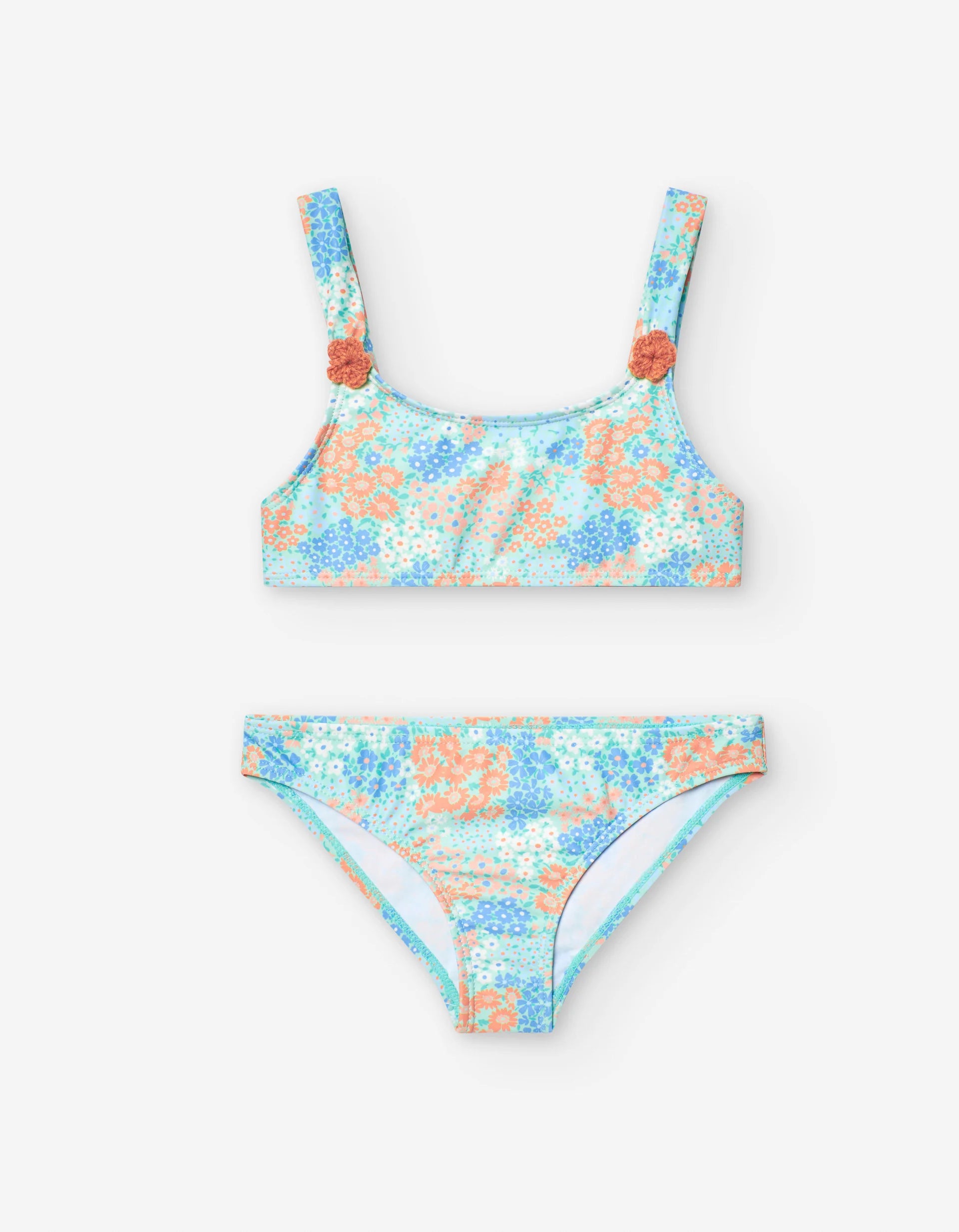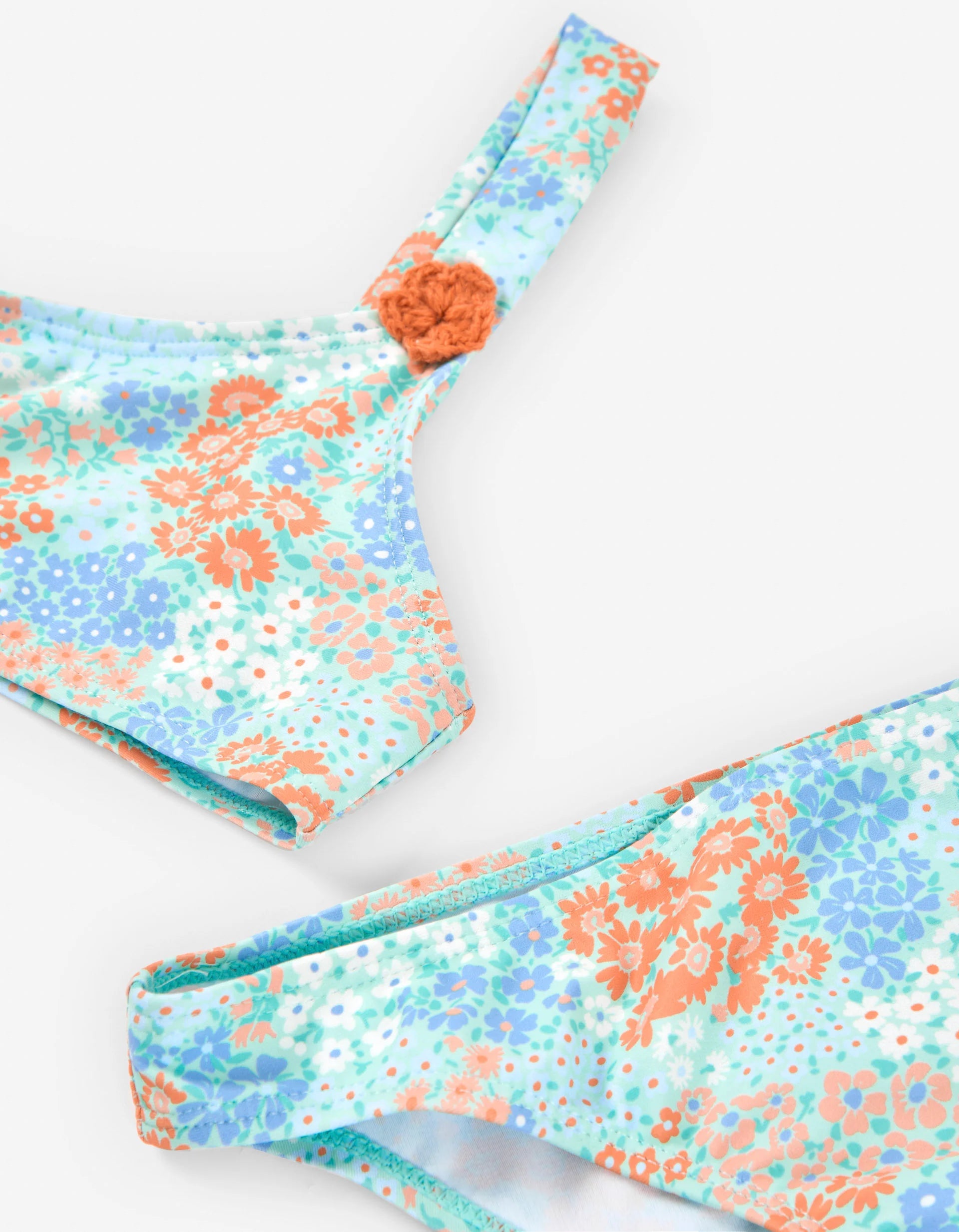 Bikini floreale nei toni del blu e del corallo per bambine. Fiori arancioni all'uncinetto sulle spalline.