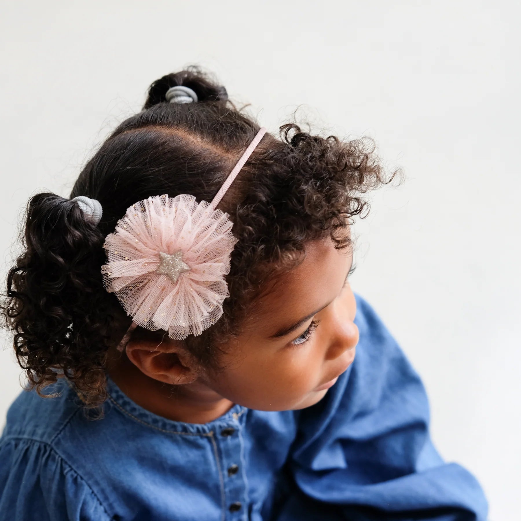 - Cerchietto con nastro grosgrain avvolto in tulle rosa pallido glitterato ispirato al tutù con stella glitterata dorata al centro