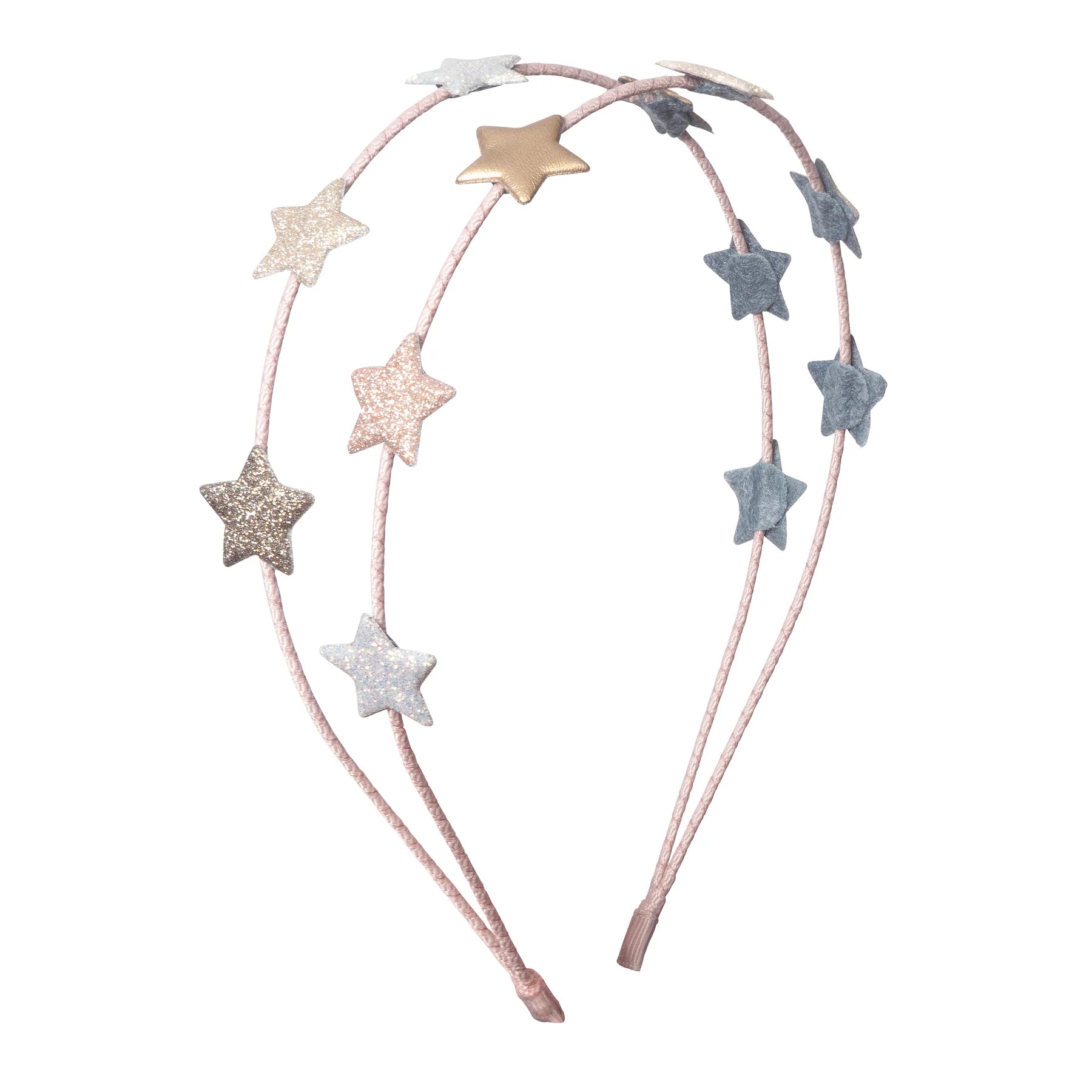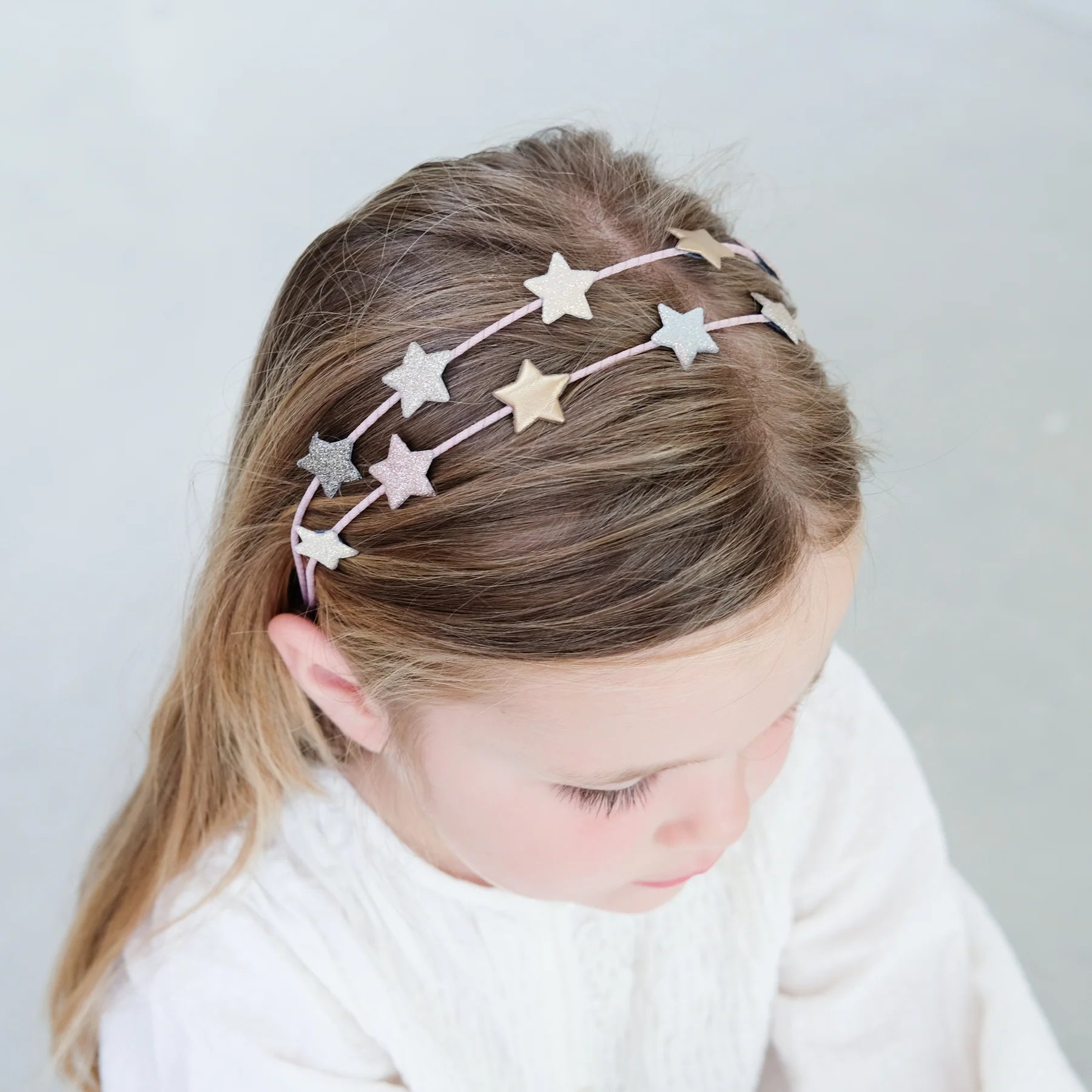 - Cerchietto di Alice avvolto in un morbido nastro rosa con due file ornate da 12 stelle imbottite in un mix di glitter e tessuti metallici