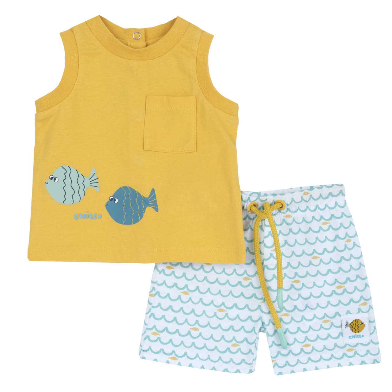 - Canotta tinta unita, stampa pesci frontale con parti a rilievo e taschina
