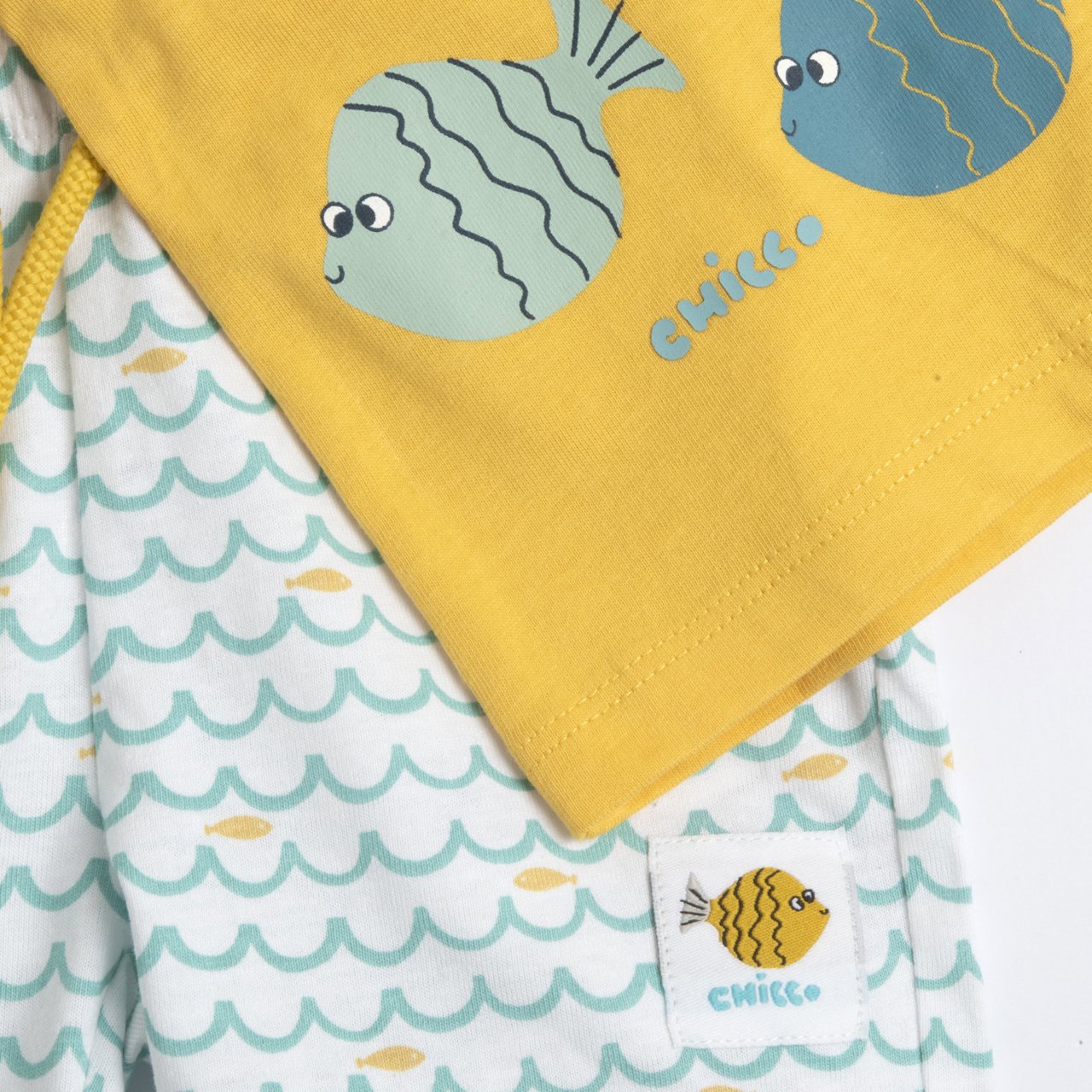 - Pantaloni con stampa fantasia onde e pesciolini con etichetta jacquard