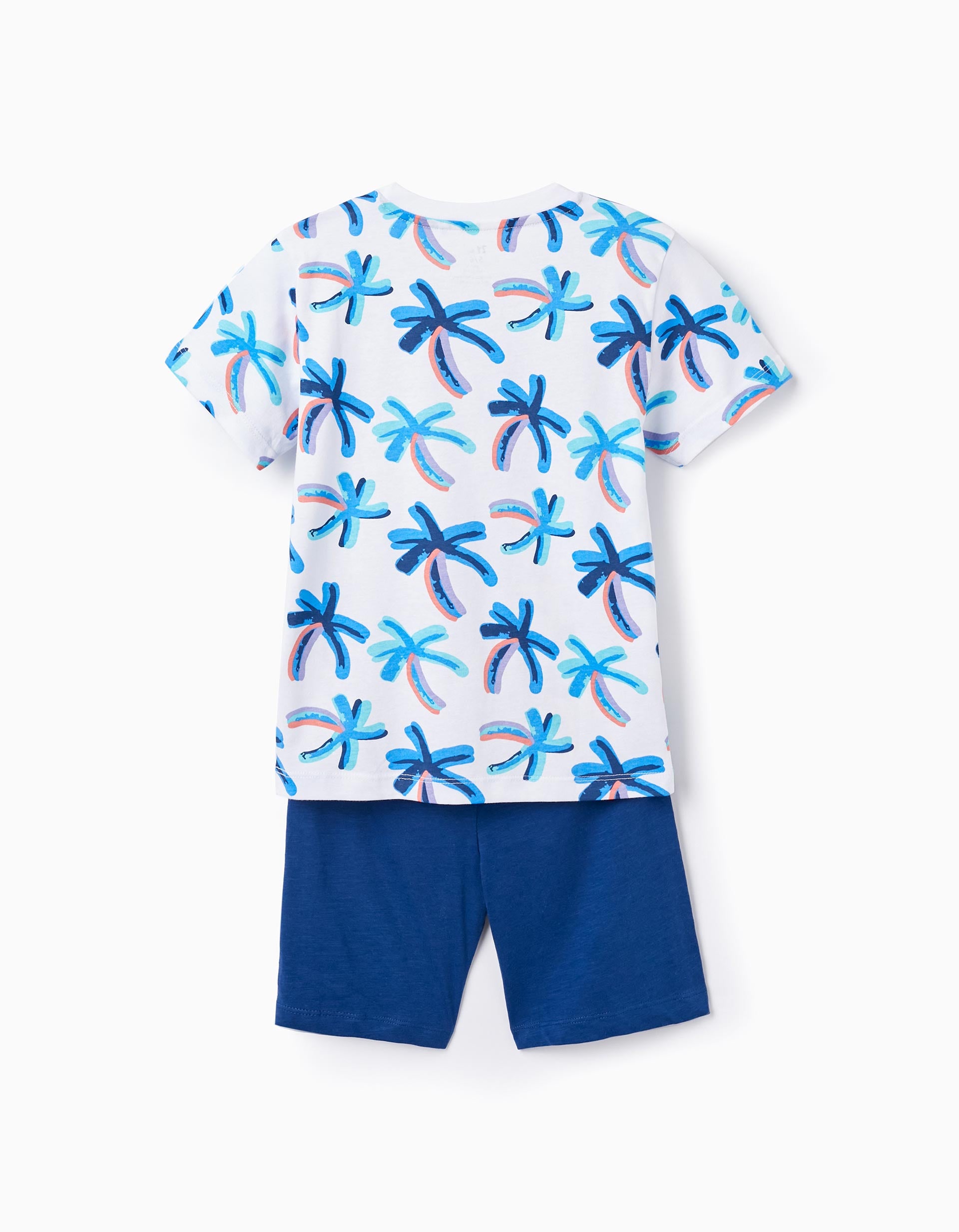 Completo due pezzi per bambino, 100% cotone. È composto da una t-shirt bianca con un motivo colorato di palma. Include anche pantaloncini blu scuro in jersey di cotone, con elastico in vita e coulisse. Un set di pezzi pratici e comodi da indossare insieme o separatamente.