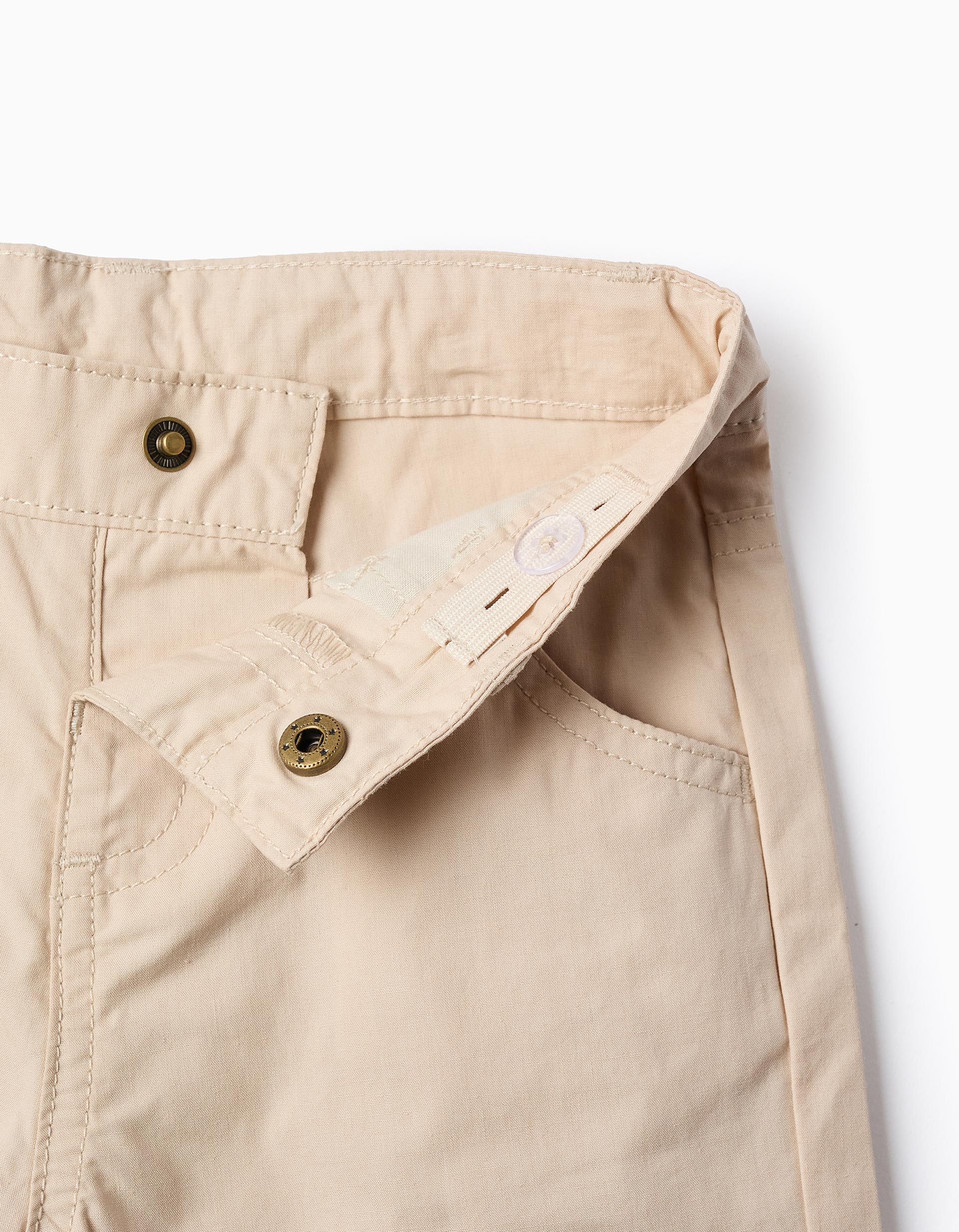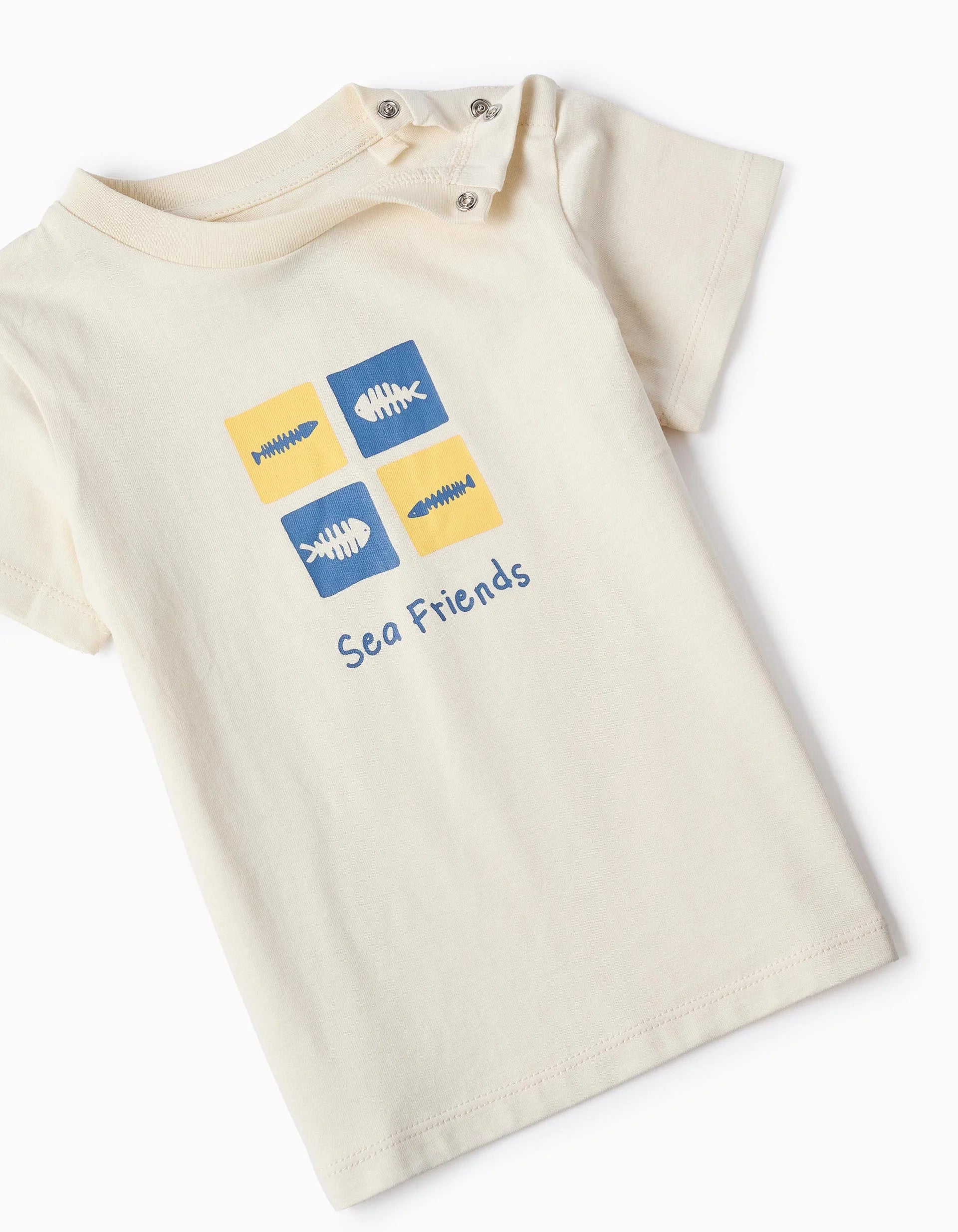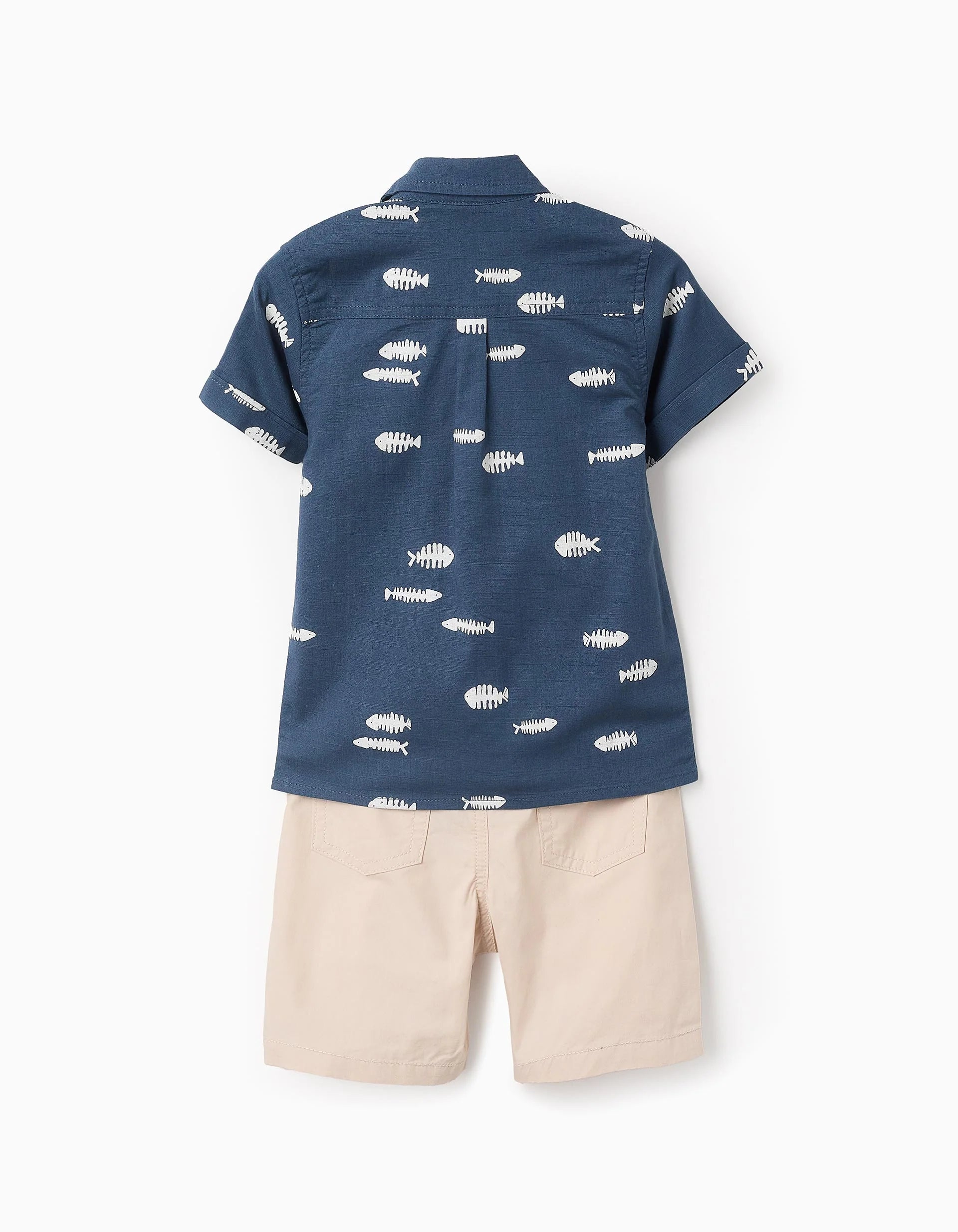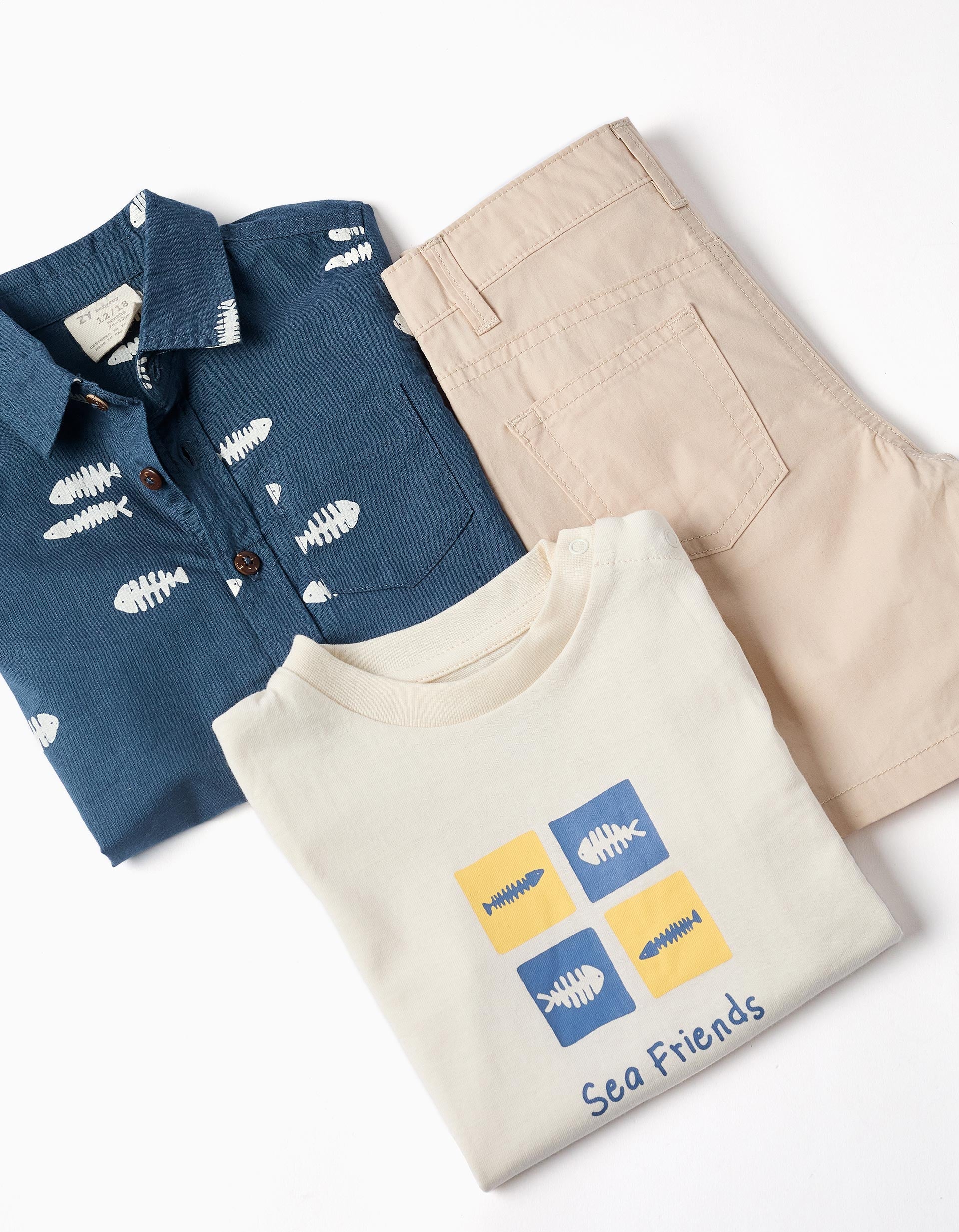 Completo tre pezzi per neonati maschi. È composto da una maglietta a maniche corte blu scuro con fantasia; una t-shirt beige con stampa frontale e pantaloncini beige. Un completo originale che consente di creare vari look!