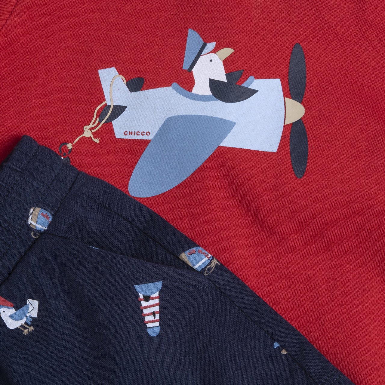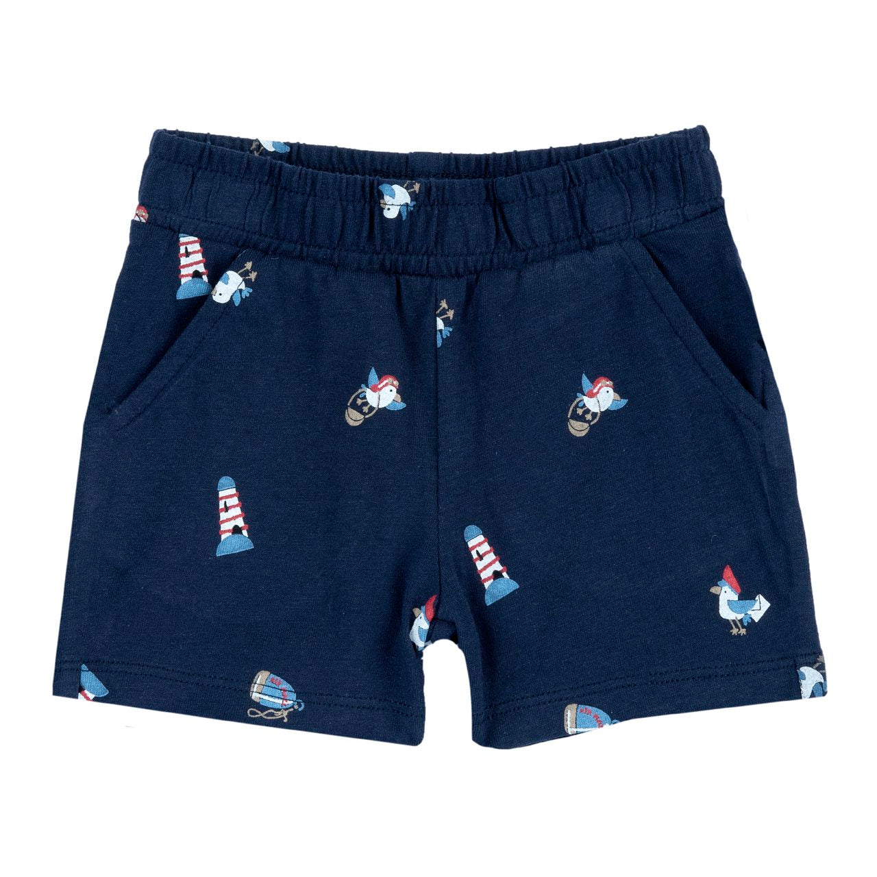 - Pantaloni blu con stampa fantasia gabbiani e fari