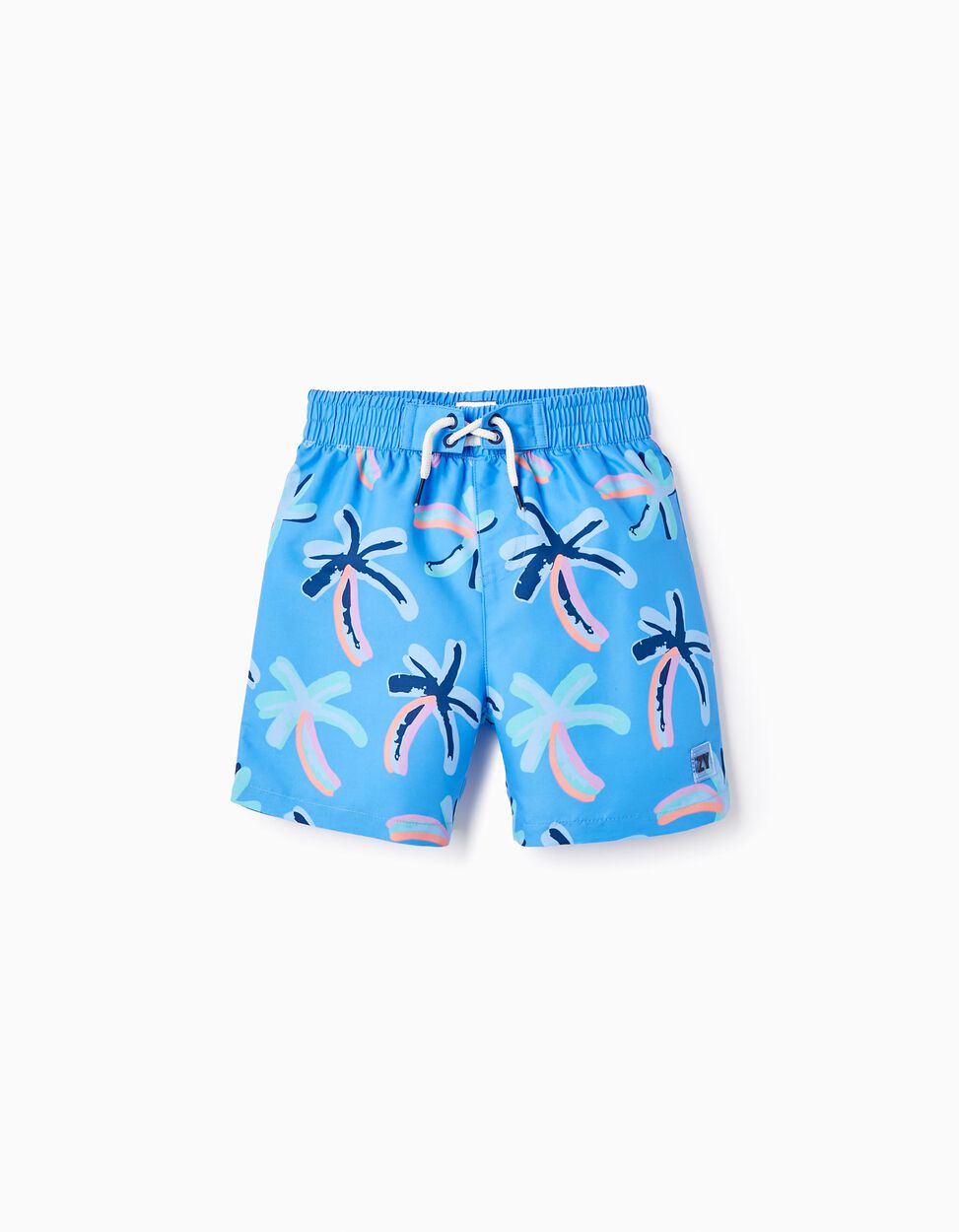 Shorts da bagno blu per bambino, con fantasia di palme multicolori. Con slip interno in rete per un maggiore comfort. Vita elastica con coulisse a contrasto. L'opzione ideale per le vacanze estive. We Care: Tessuto con fattore di protezione solare 80, secondo il certificato UV Standard 801, che garantisce l'efficacia del tessuto in condizioni asciutte, bagnate, distese e dopo i lavaggi.