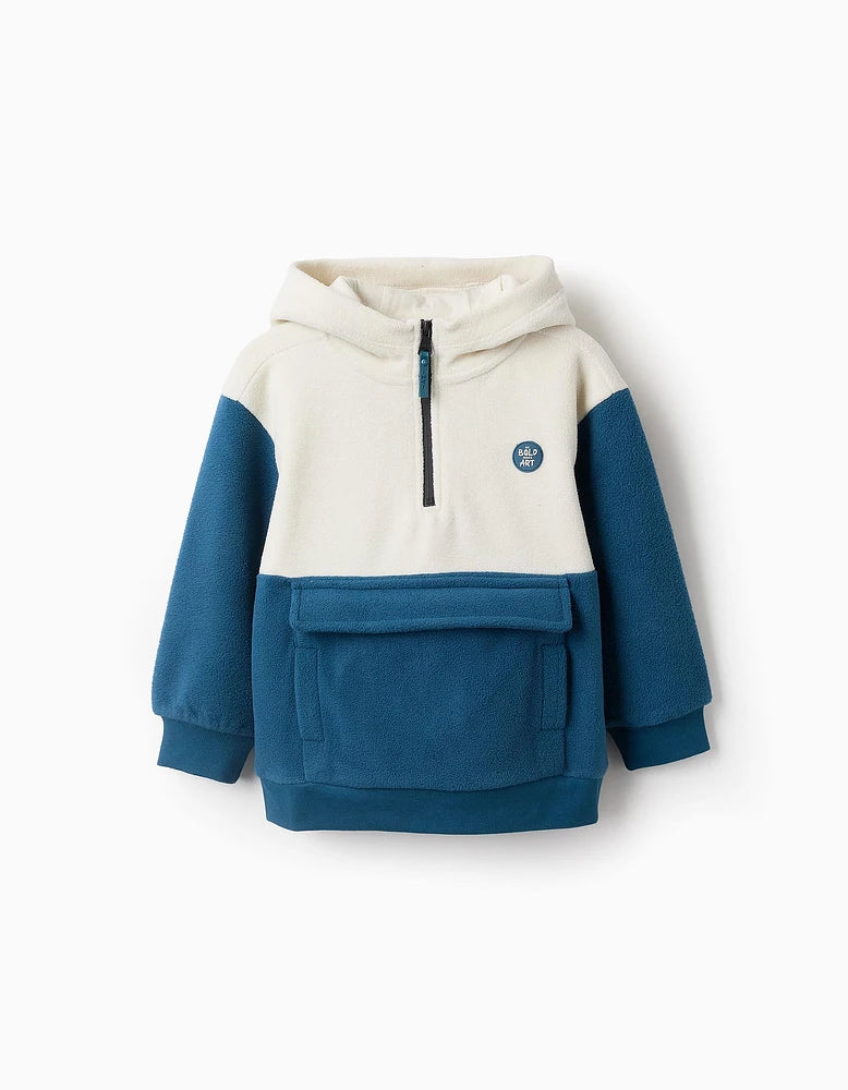 Felpa in pile con cappuccio 'Art' bianco e blu, foderata in jersey di cotone e chiusura con cerniera nella parte superiore. Dettaglio in gomma sul petto. Tasca a marsupio. Polsini a costine per una vestibilità perfetta. Una felpa calda e confortevole, ideale per i mesi invernali.