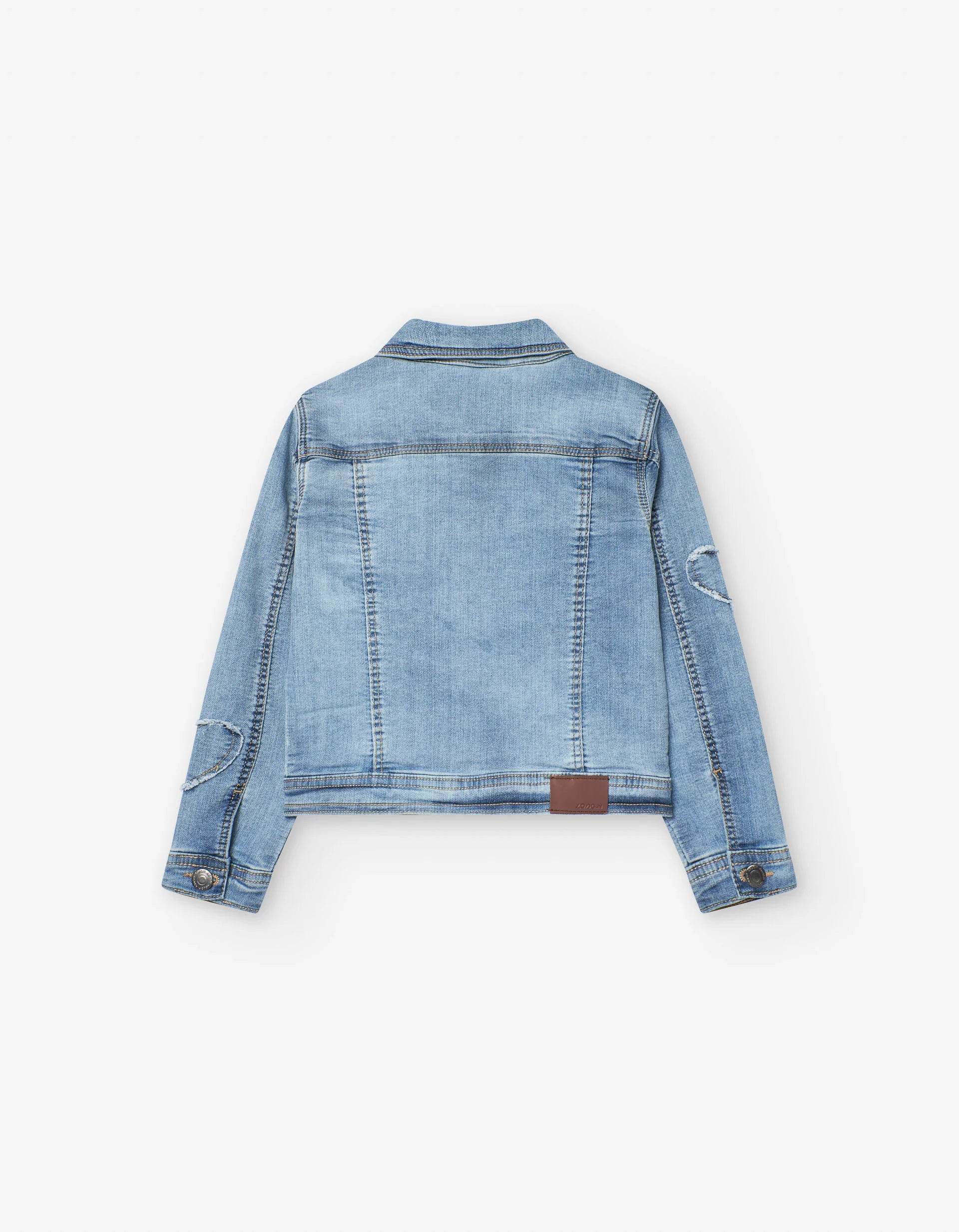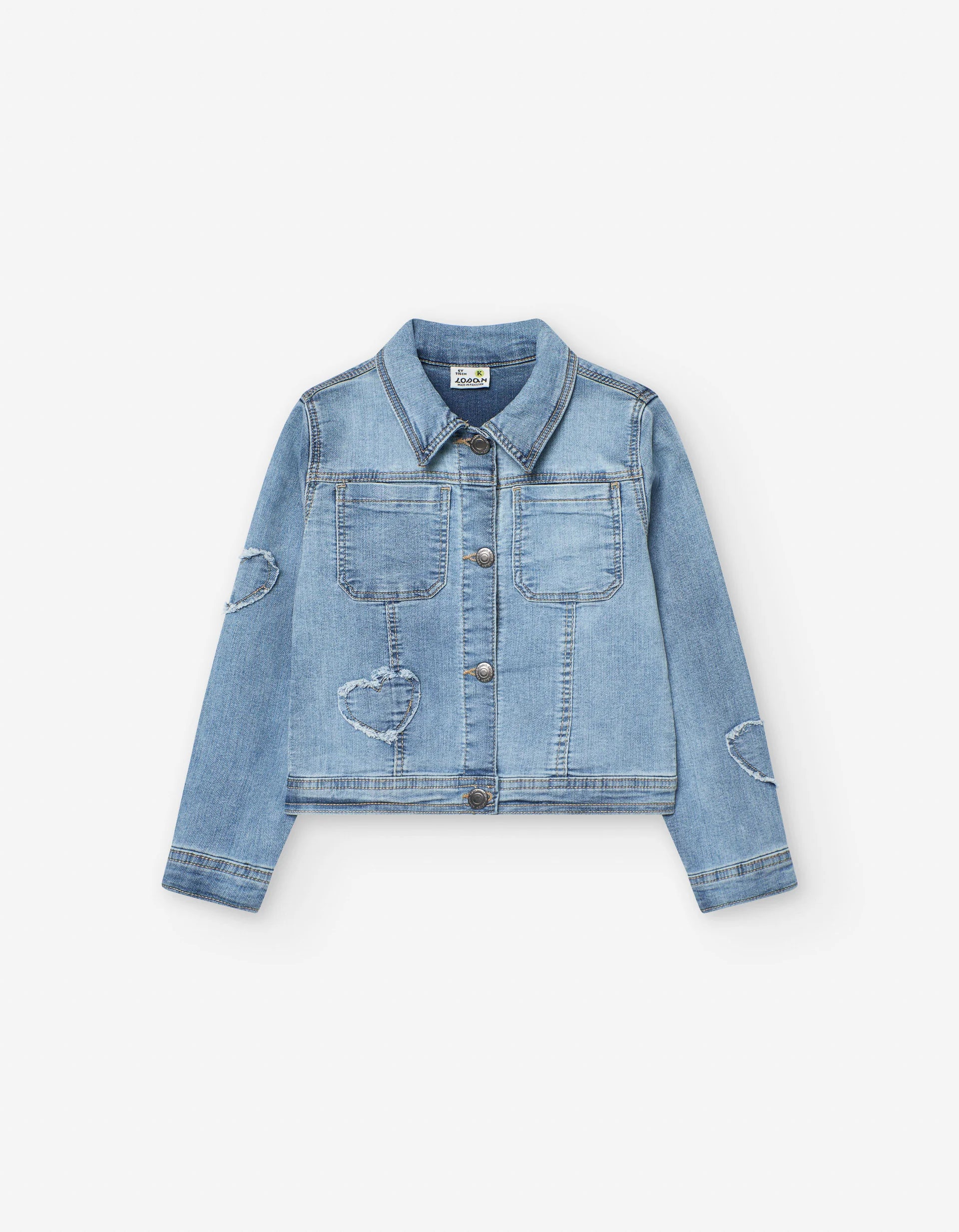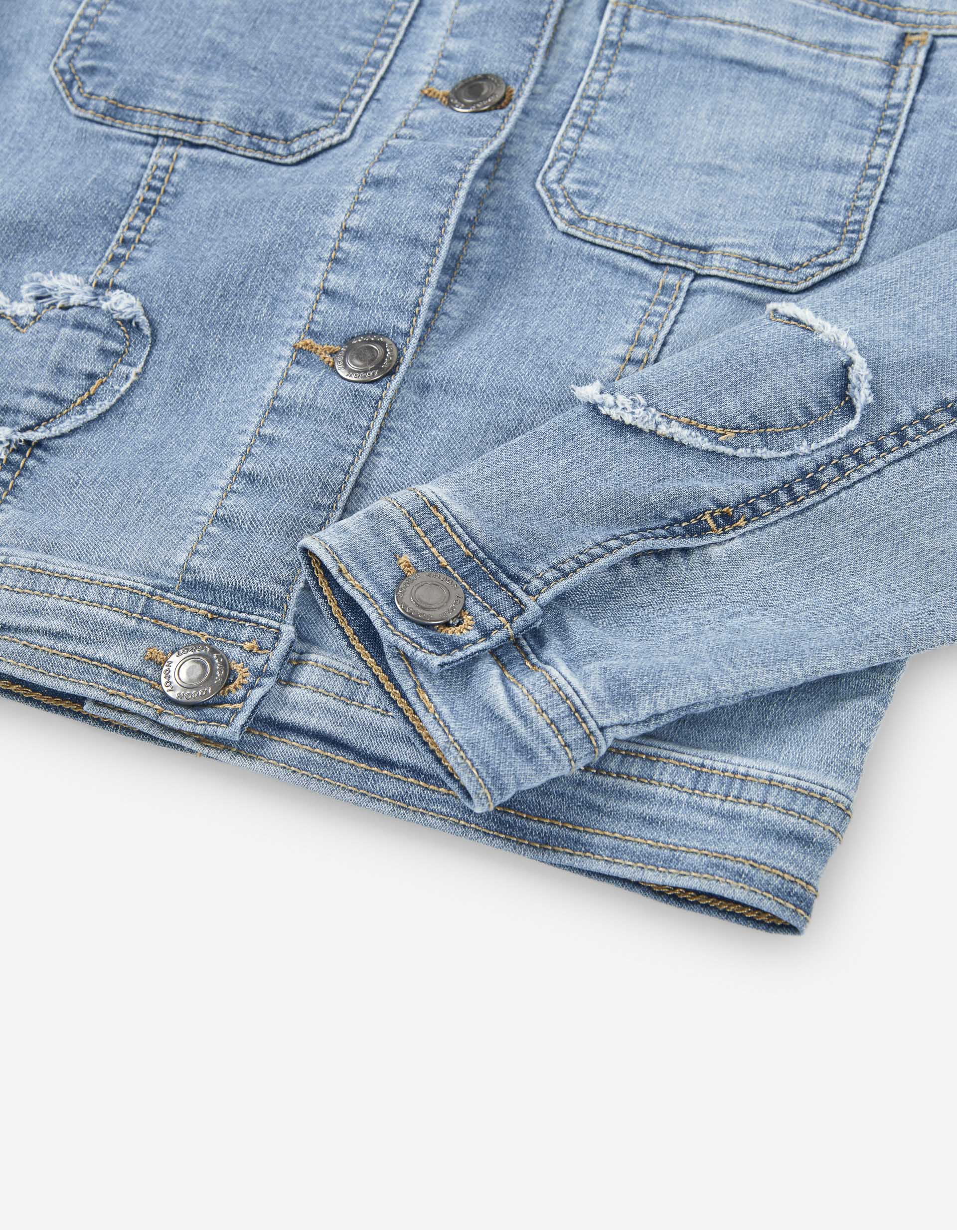 Giacca di jeans blu per bambine, con dettagli a forma di cuore sfrangiato. Bottoni argentati.