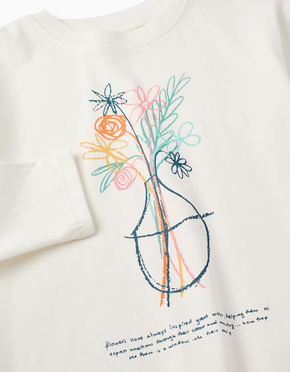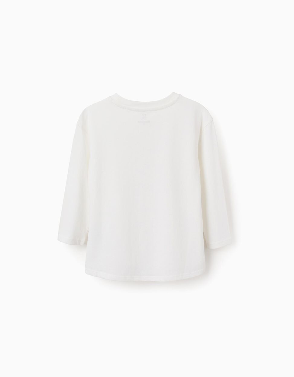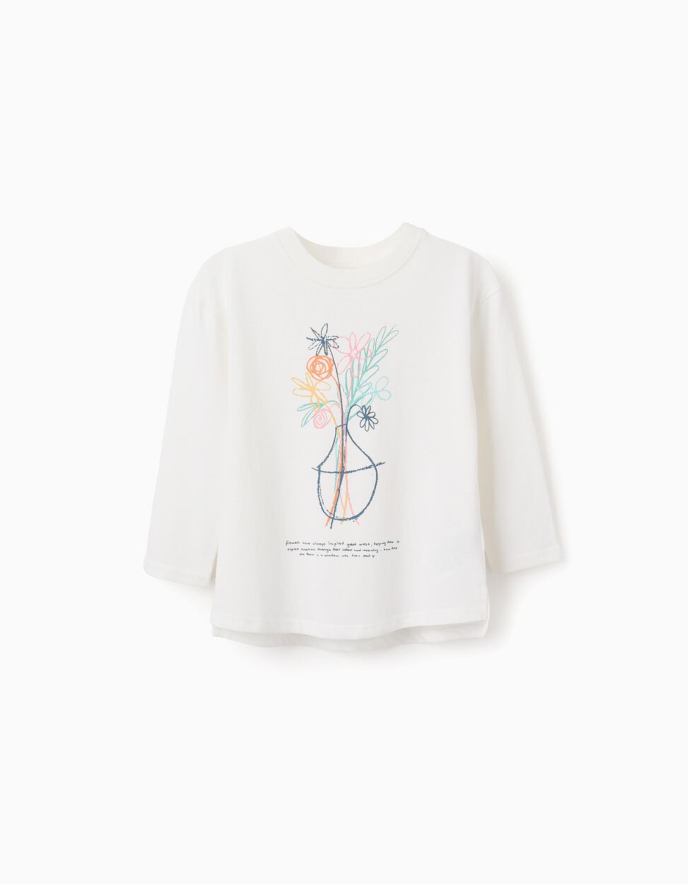 T-shirt bianca a maniche lunghe per bambina, 100% cotone. Stampa frontale. Base leggermente asimmetrica, con piccoli spacchi sui lati. Etichetta interna stampata per non irritare la pelle. Ideale per i look urban di tutti i giorni. We Care: articolo con certificazione Oeko-Tex Standard 100, che garantisce l'assenza di sostanze nocive o irritanti per la pelle.