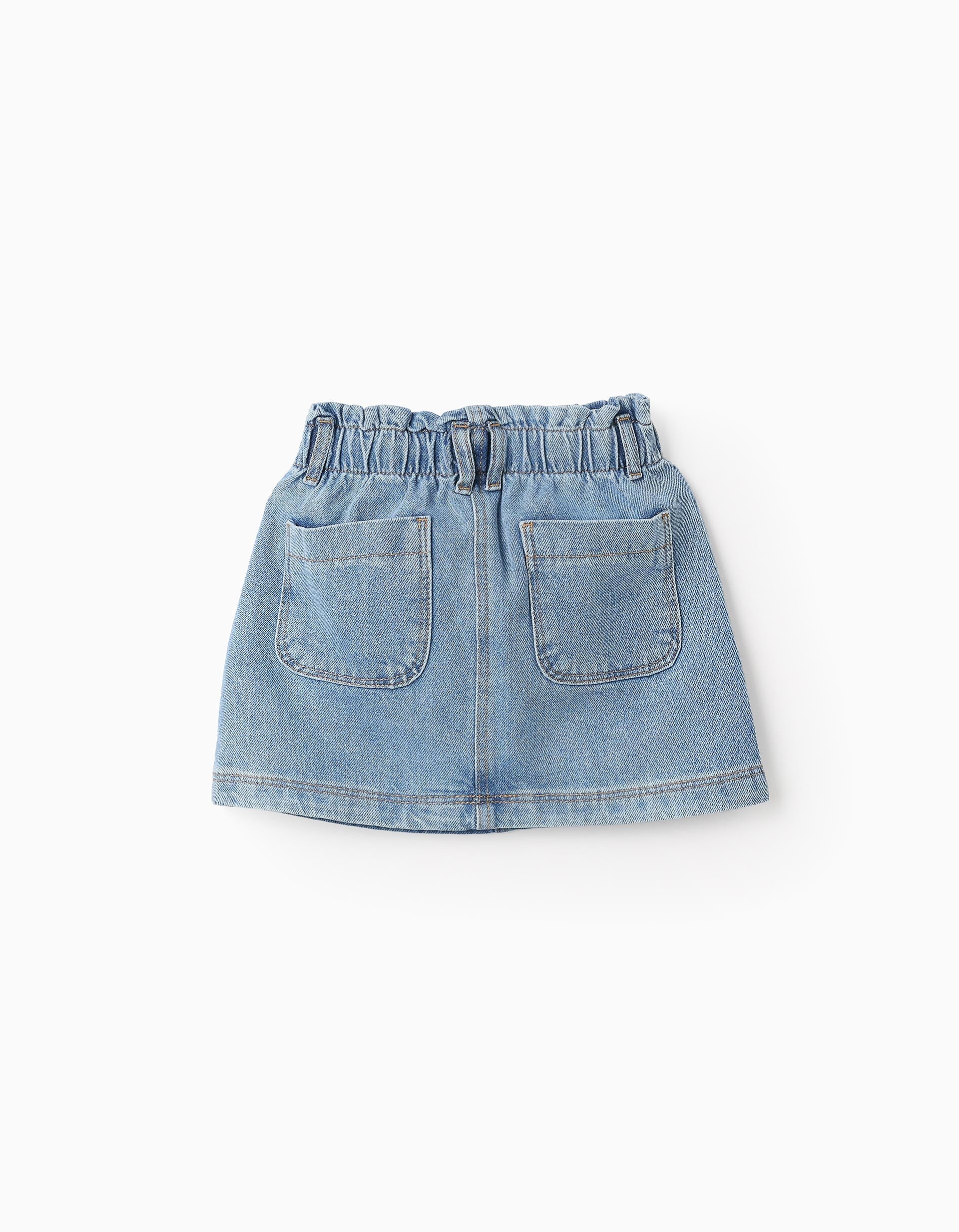 Gonna in denim blu per bambine, 100% cotone. Vita paperbag, elastica e regolabile all'interno. Quattro tasche. Chiusura con tre bottoni automatici dorati che le conferiscono un tocco elegante. Per look alla moda!