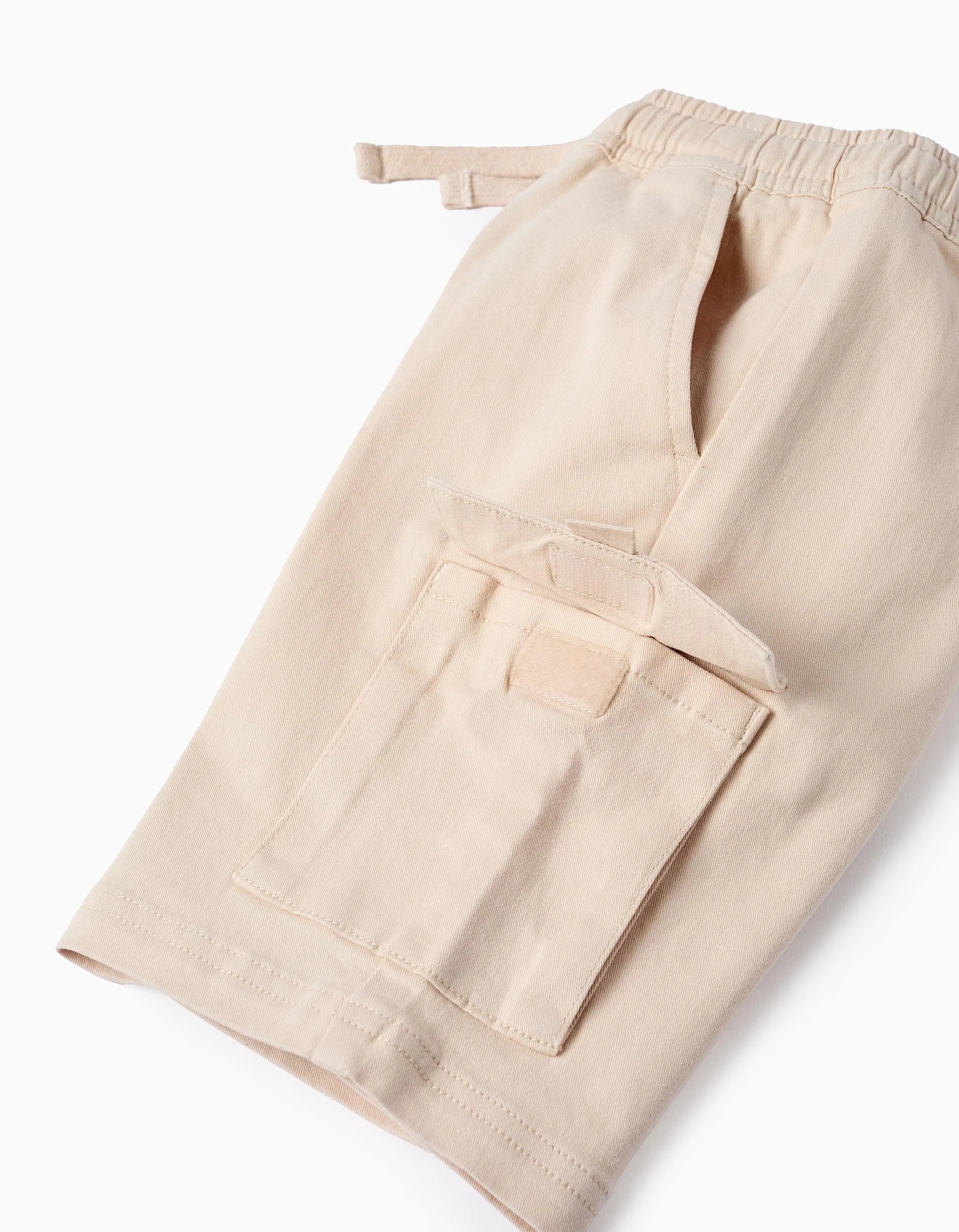 Shorts beige per bambini, in cotone con un tocco di stretch per maggiore comfort e libertà di movimento. Tasche laterali e tasche cargo. Elastico in vita con coulisse, regolabile all'interno con elastici e bottoni.