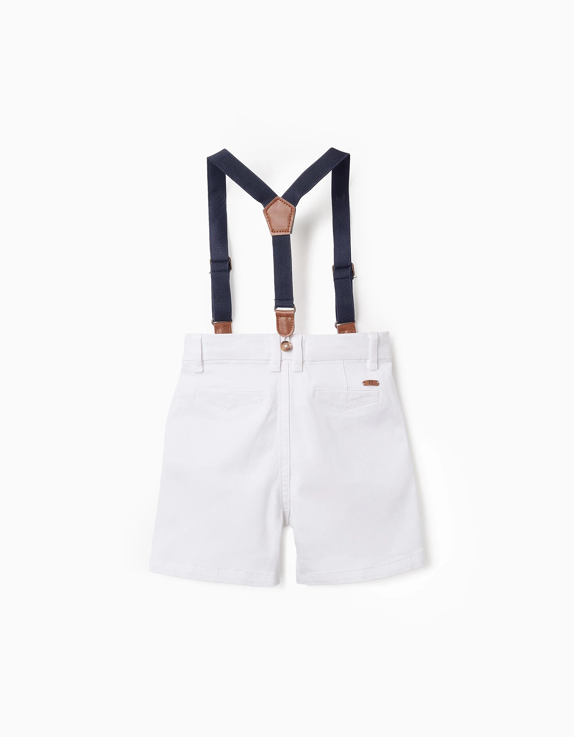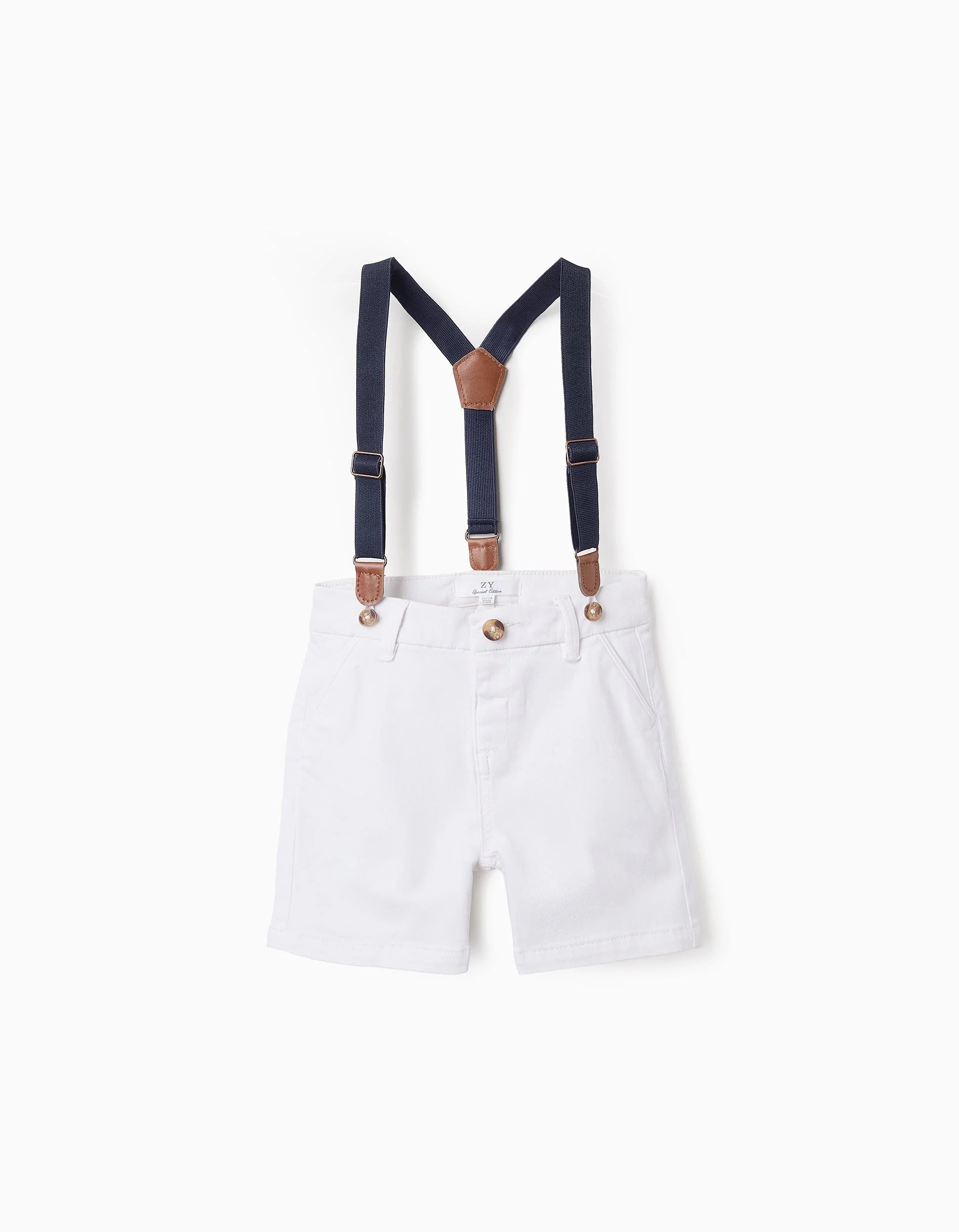 Pantaloncini bianchi chino per neonati maschi, in cotone con un tocco di stretch per maggiore comfort e libertà di movimento. Tasche laterali funzionali e tasche posteriori decorative. Si chiudono facilmente con un bottone automatico. Tinti in capo. Include bretelle elastiche blu scuro con dettagli in pelle sintetica marrone. Rimovibili, per consentire look diversi.