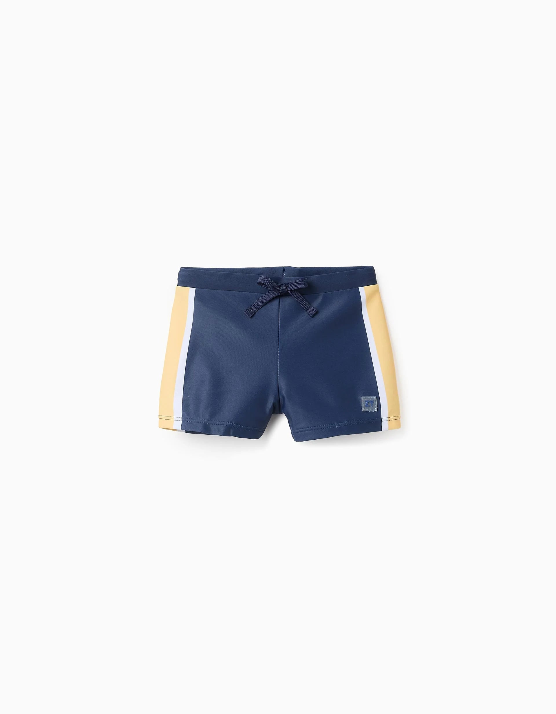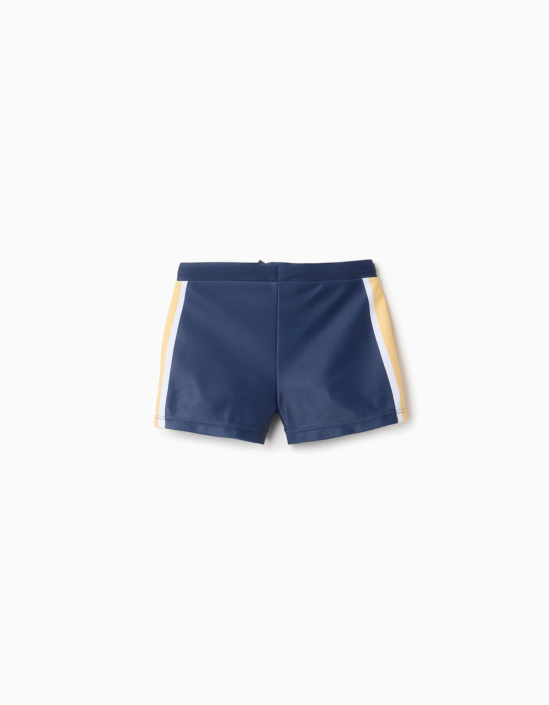 Pantaloncini da bagno blu scuro per ragazzi, realizzati in nylon comodo e flessibile, con strisce laterali bianche e gialle. Vita comoda e flessibile con coulisse regolabile. Fodera in rete per il massimo comfort.