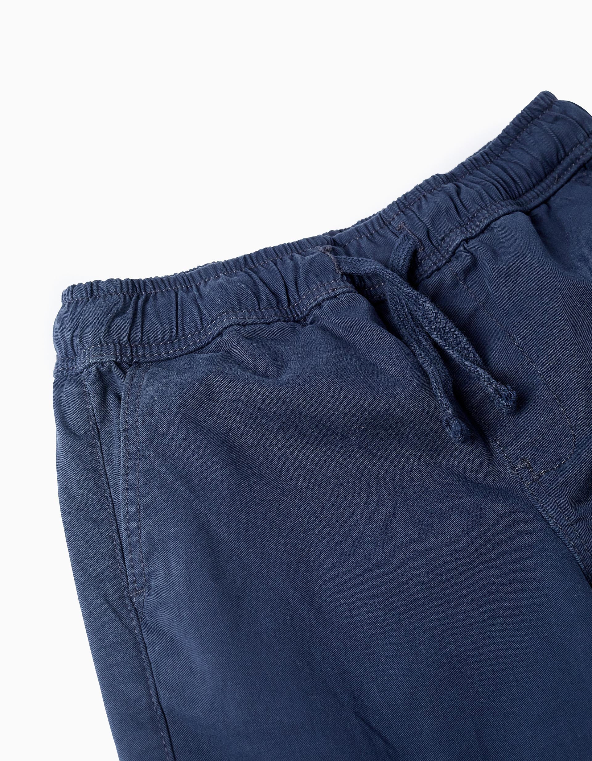 Pantaloni blu scuro per bambini, in twill di cotone con un tocco di stretch per maggiore comfort e libertà di movimento. Vestibilità slim. Con due tasche cargo, due tasche laterali e una tasca posteriore. Vita elasticizzata con coulisse di regolazione. Un paio di pantaloni leggeri, comodi e pratici per l'uso quotidiano.