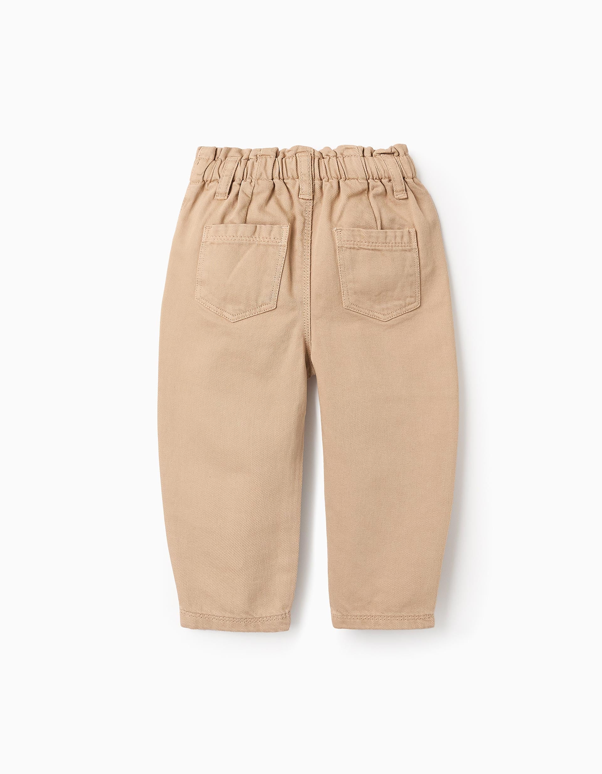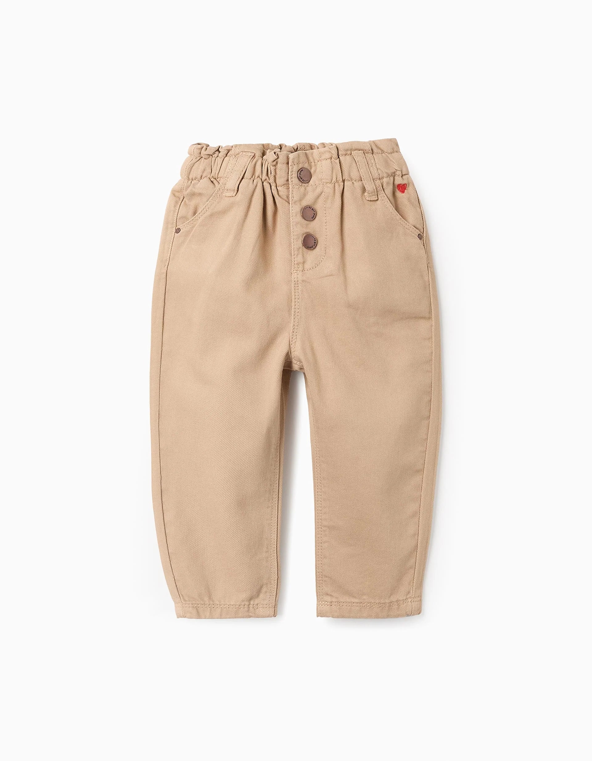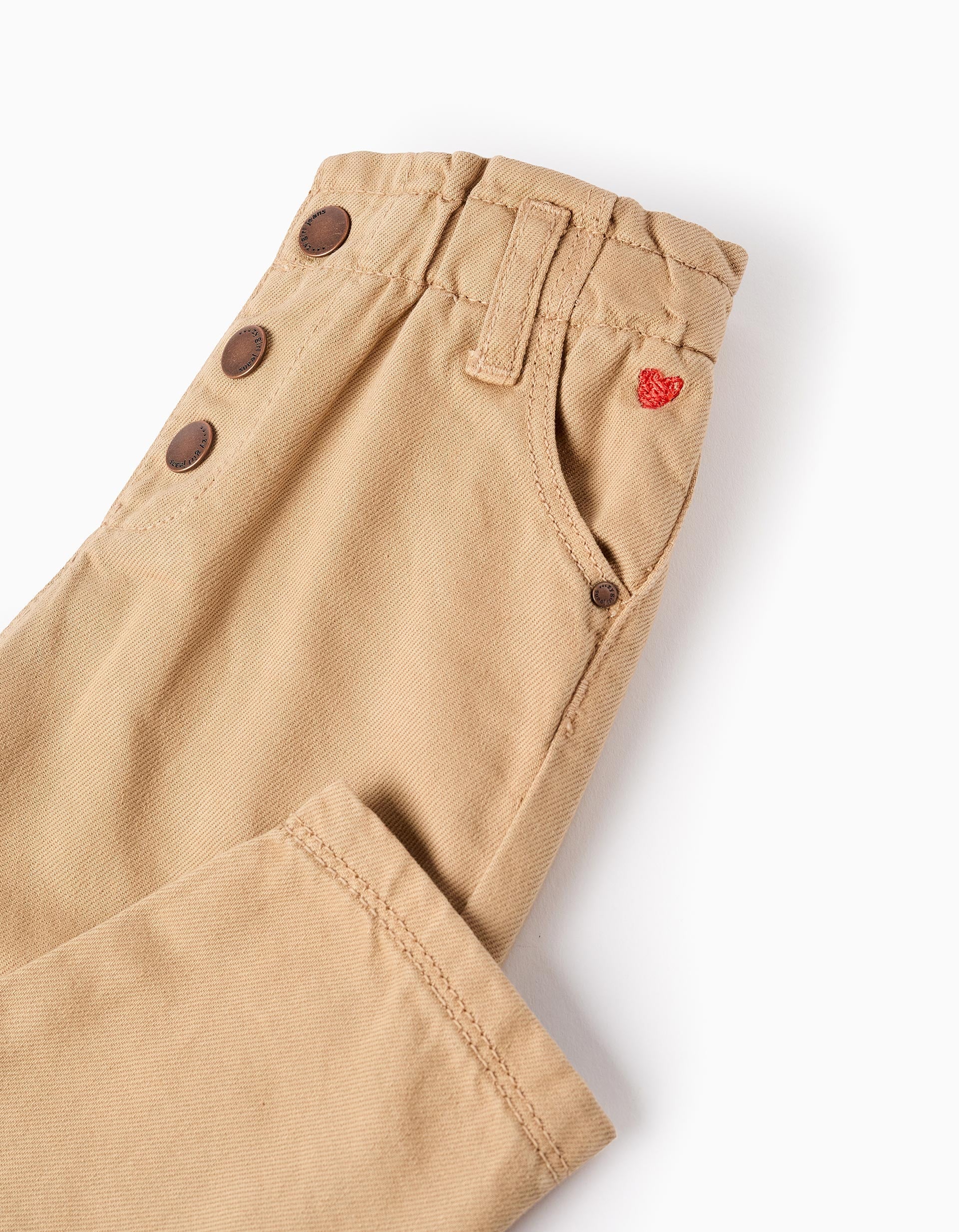 Pantaloni beige per neonata, in twill di cotone 100%. Stile paperbag, con elastico e vita arricciata. Bottone automatico funzionale in alto e bottoni decorativi sotto. Quattro tasche. Dettaglio di un piccolo cuore ricamato sul lato, che gli conferisce un tocco grazioso