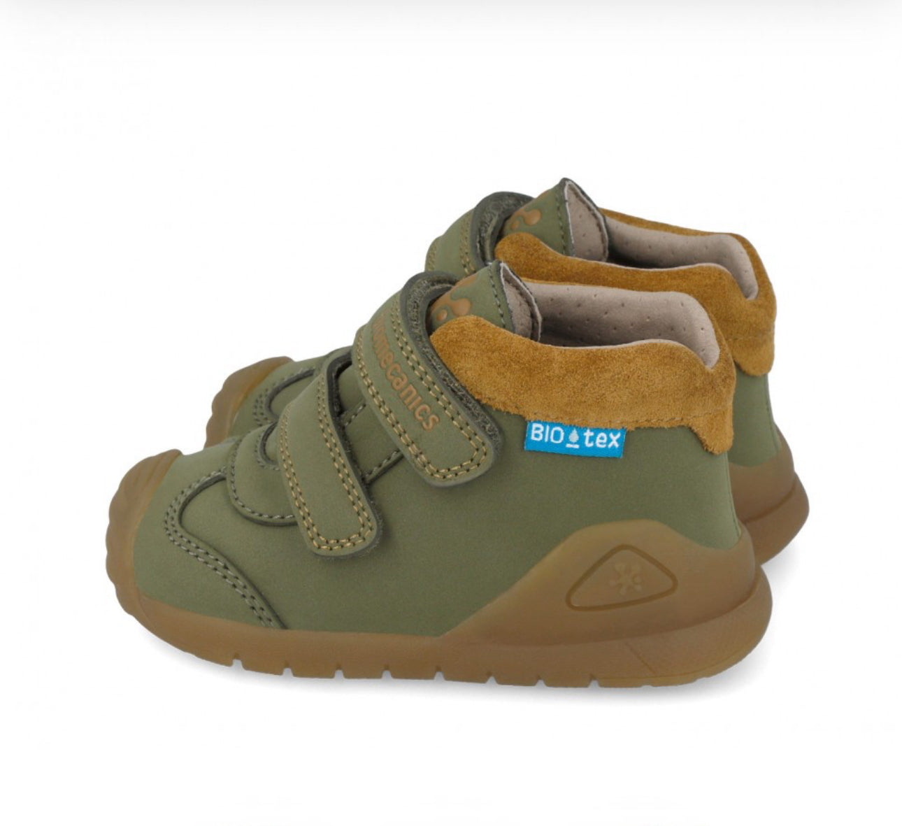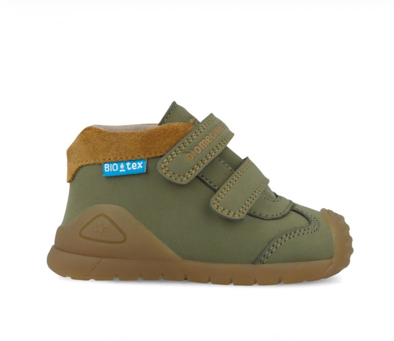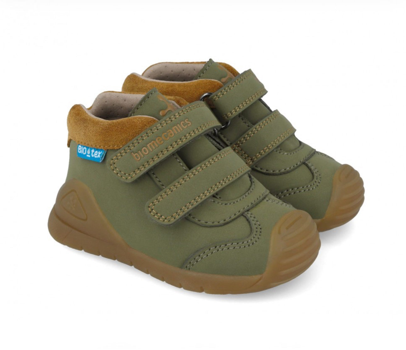 Scarponcini impermeabili in pelle Biomecanics per bambini. Membrana impermeabile Bio_Tex. Sviluppati in collaborazione con l'Istituto di Biomeccanica di Valencia. La calzatura è ergonomica e adatta ai piedi in ogni fase dello sviluppo. Progettata per offrire protezione in ambienti non controllati. Così possono muovere i primi passi in tutta sicurezza! La suola scanalata garantisce la massima aderenza. Le scarpe non limitano il movimento della caviglia, grazie al taglio posteriore a U, che previene la pressione sul tendine d'Achille.