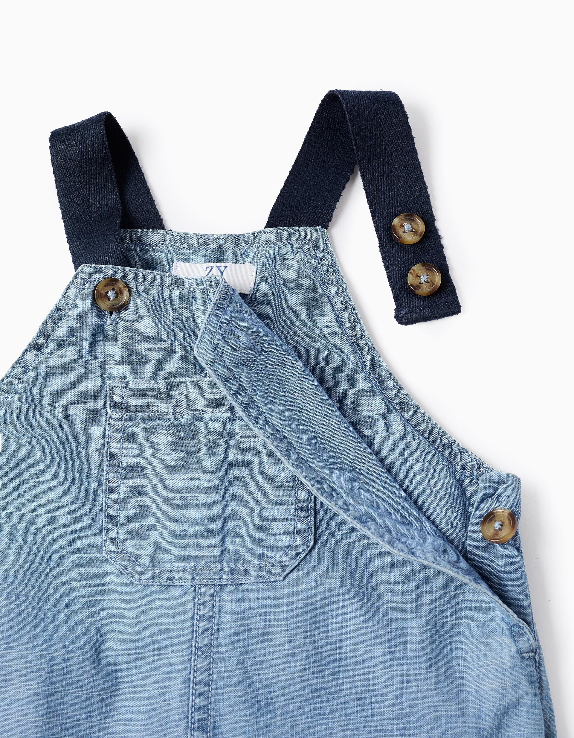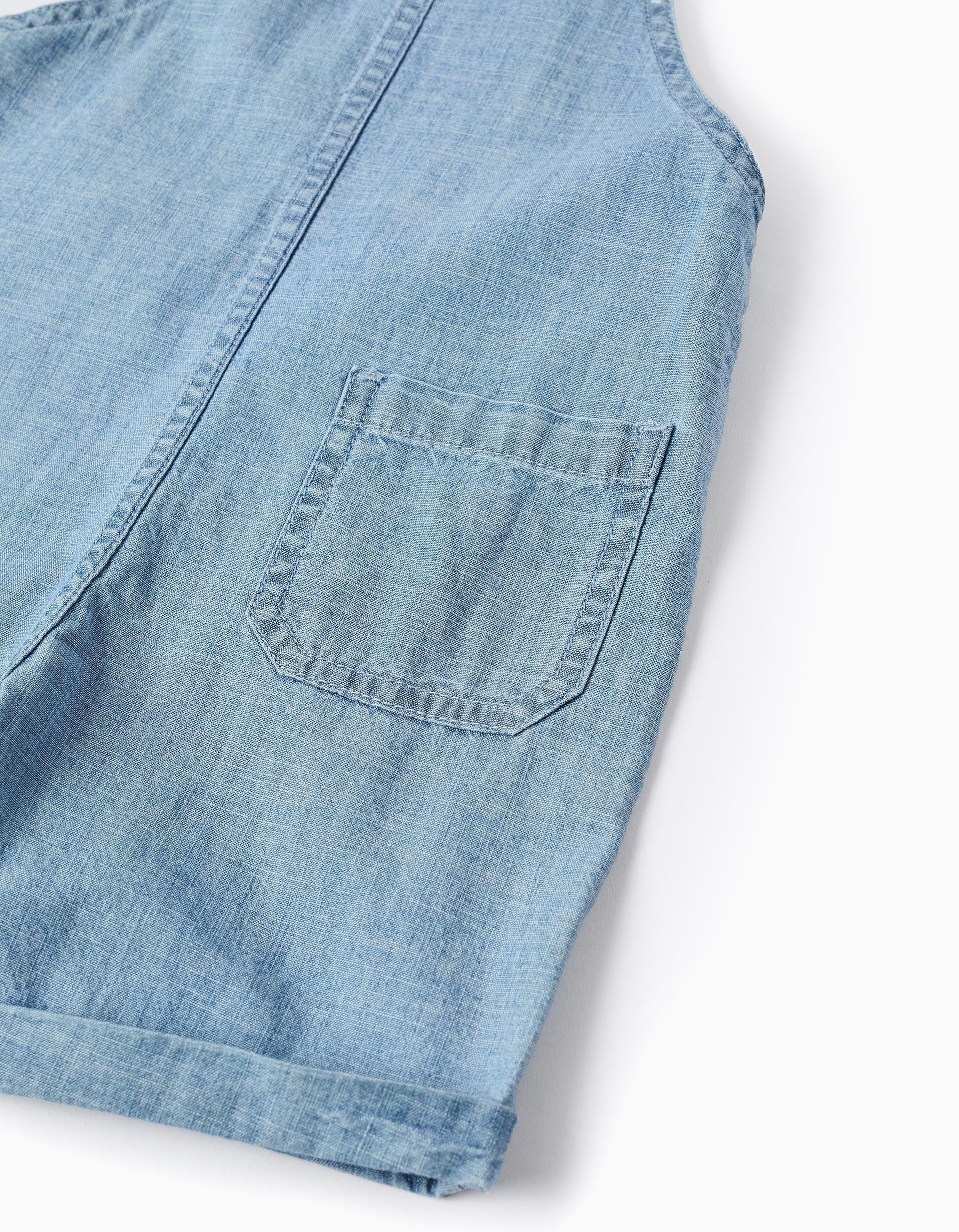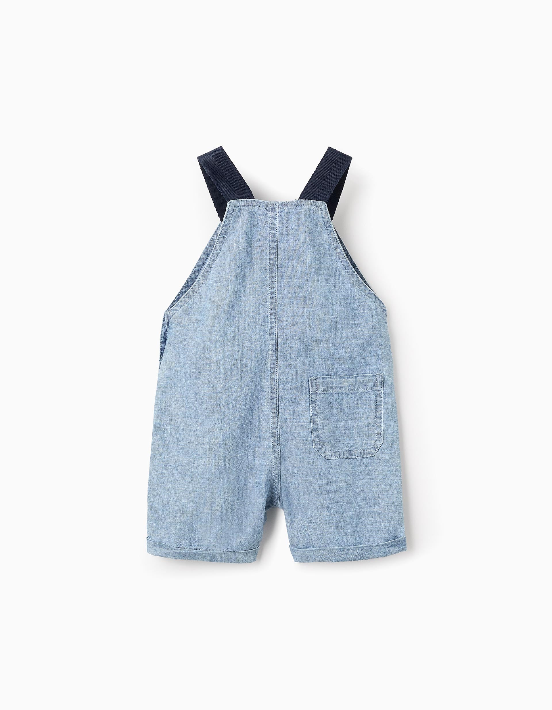 Salopette corta in denim azzurro. Spalline blu scuro a contrasto. Tasca a marsupio e tasca posteriore. Orlo risvoltato. Vestibilità ampia e fluida. Versatile e intramontabile!