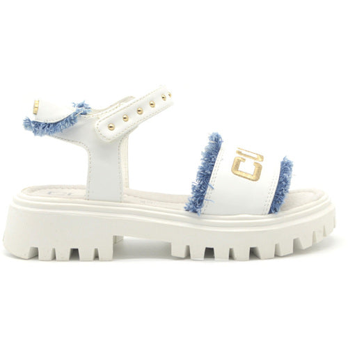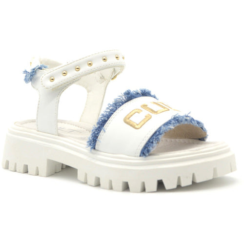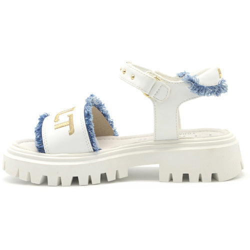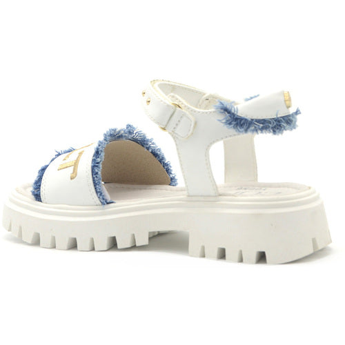 Cult sandalo ragazza in ecopelle e tessuto con frangia jeans, logo sulla fascia e borchiette decorative, chiusura con strap, sottopiede in vera pelle, fondo a carrarmato in gomma.