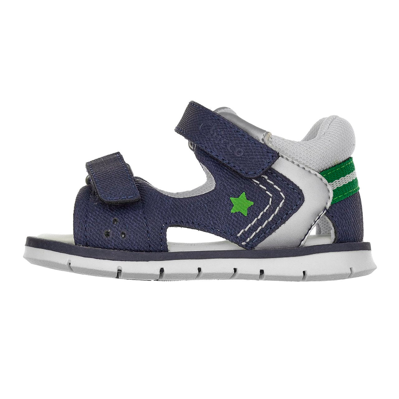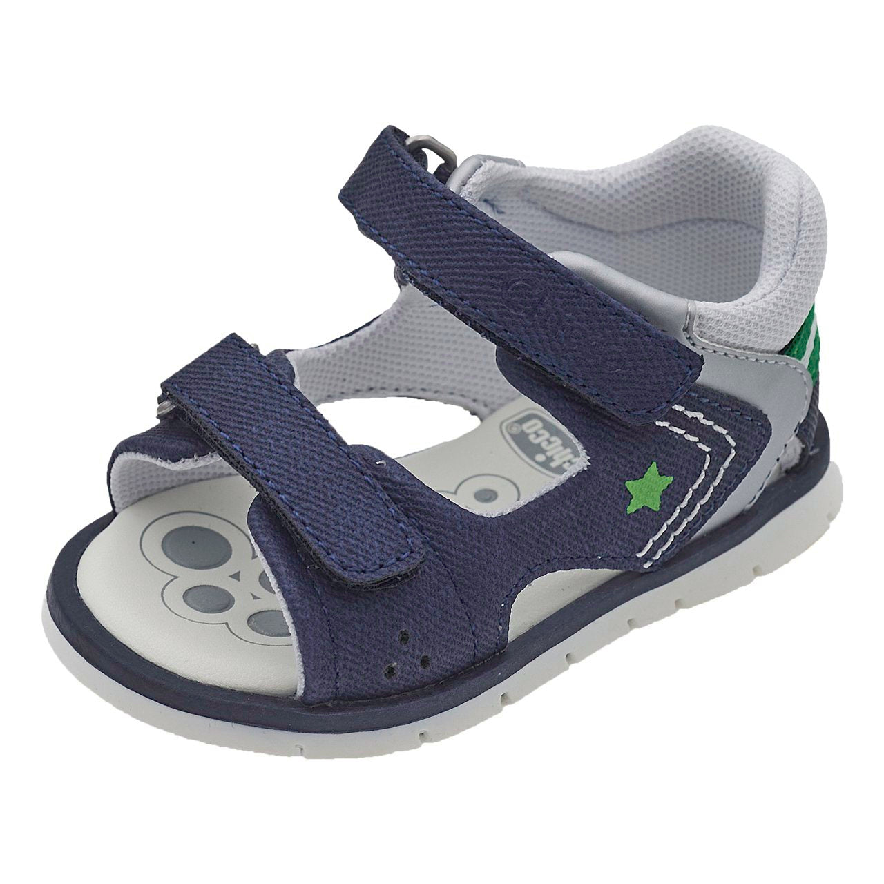 - Sandalo da bambino primi passi a punta aperta con doppia regolazione velcro, con inserti in tessuto e piccoli dettagli colorati