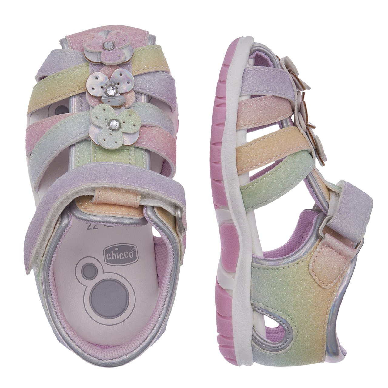 - Sandalo da bambina con punta e tallone chiuso, regolabile con velcro. Realizzato in glitter multicolor con applicazione di fiori e strass