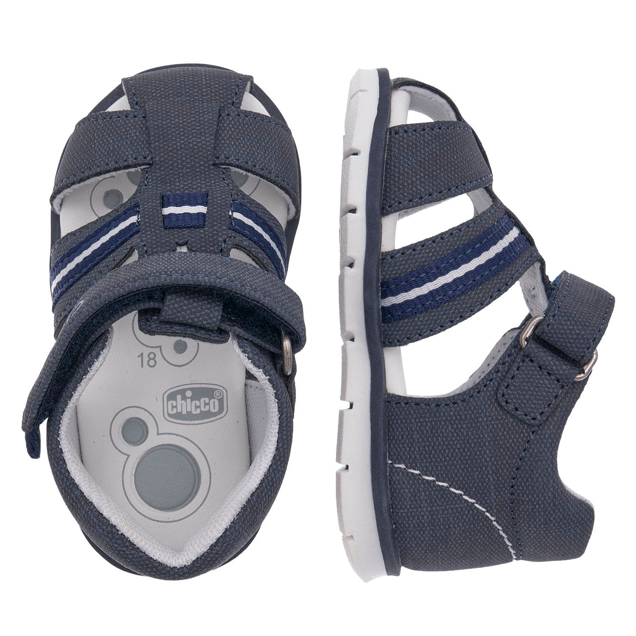 - Sandalo da bambino primi passi a punta chiusa dallo stile formale con tape bicolore, regolabile con velcro.