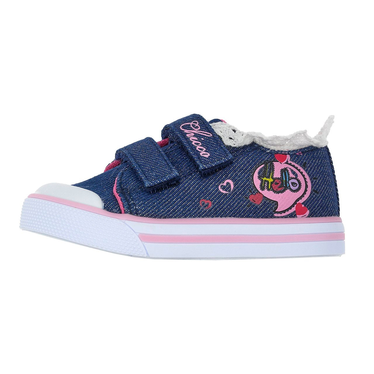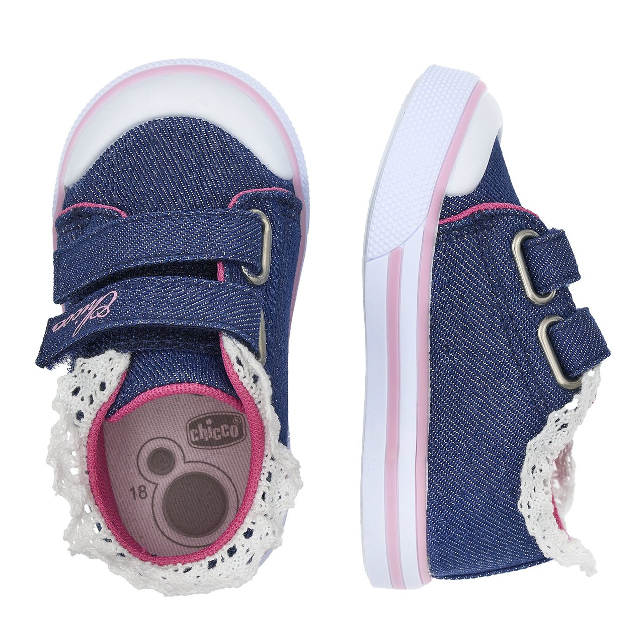 • Sneakers primi passi da bambina in tessuto glitter con stampa laterale. Bordo della scarpa in pizzo con doppio velcro