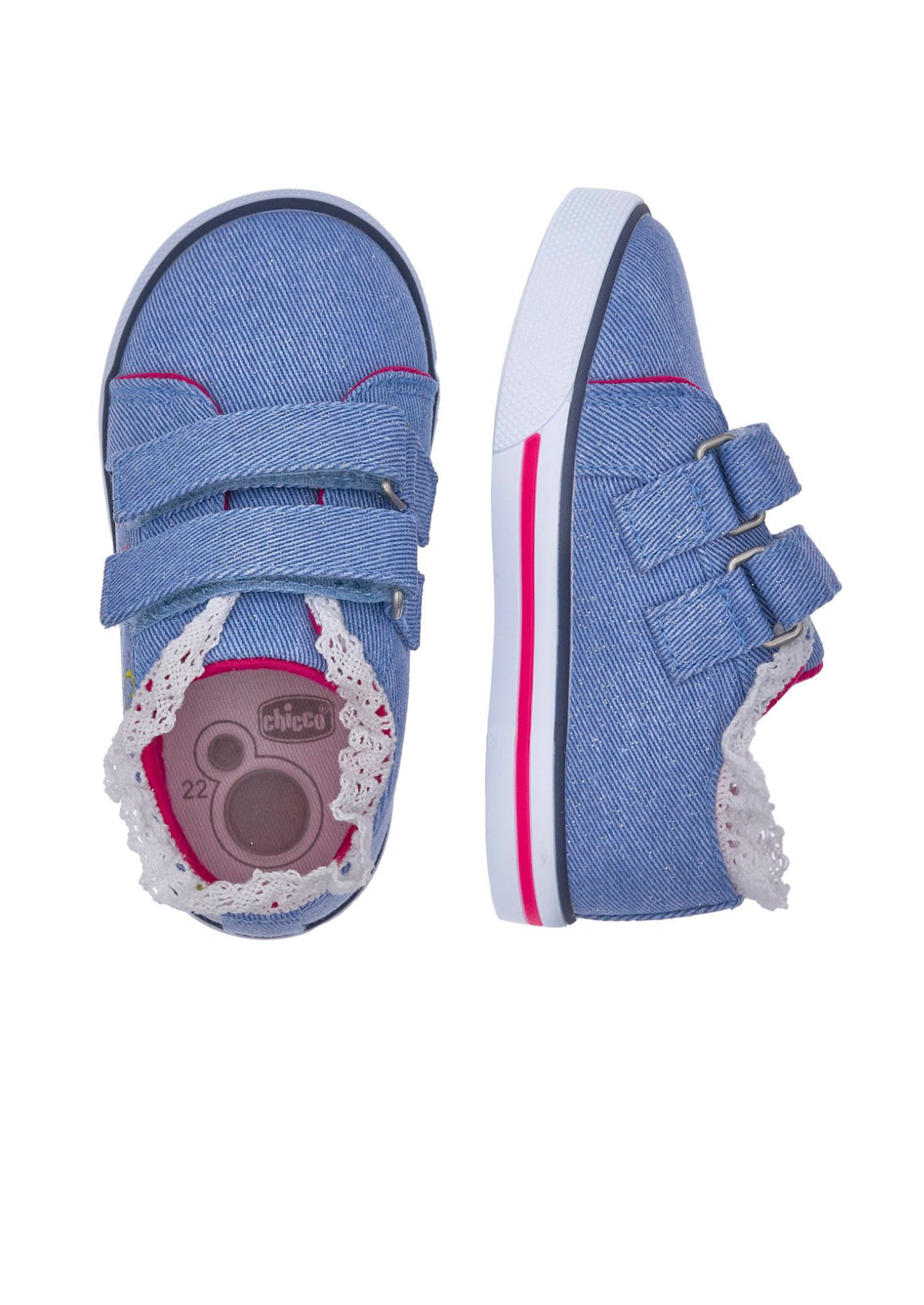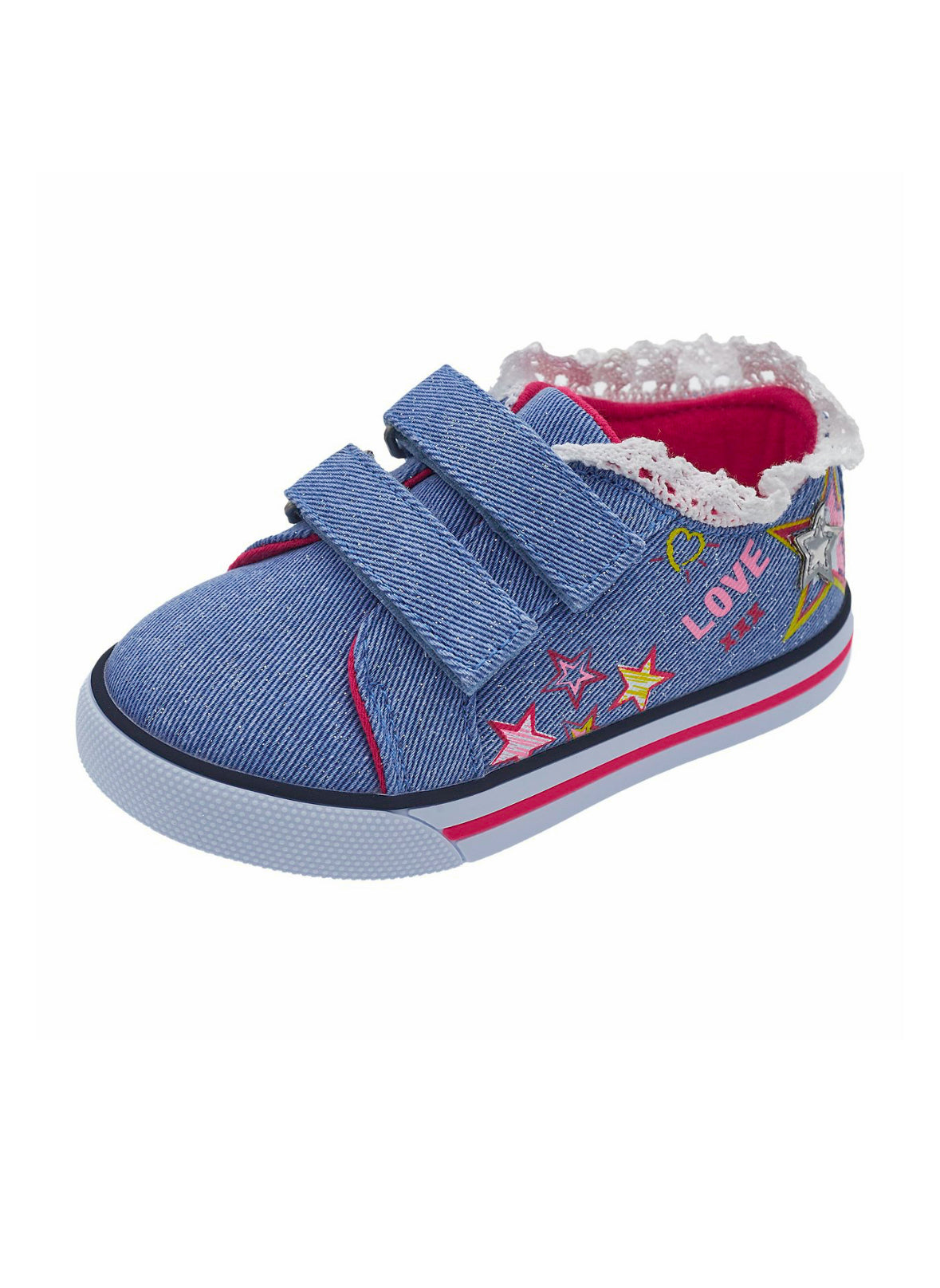 - Sneakers da bambina in tessuto glitter jeans stampato con stella laminata. Bordo della scarpa in pizzo con doppio velcro