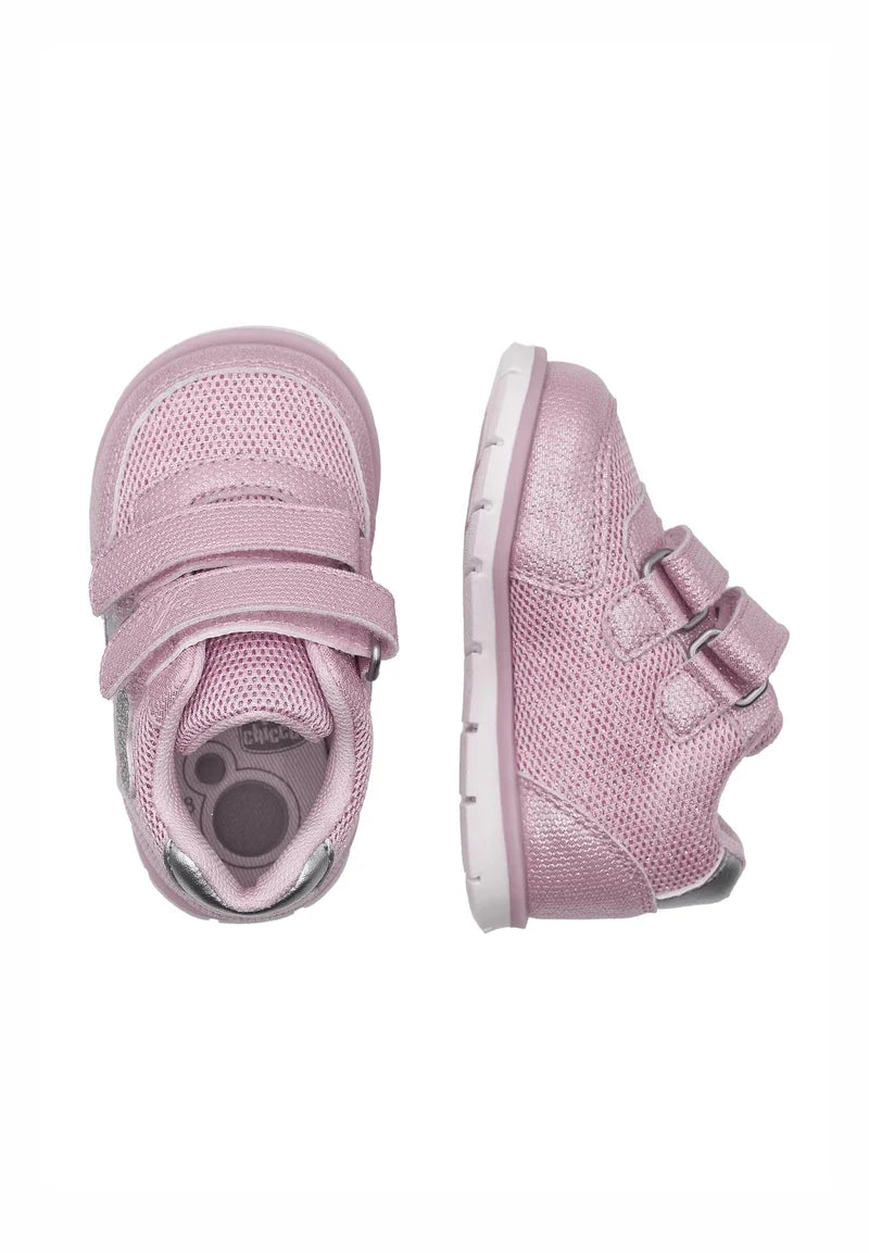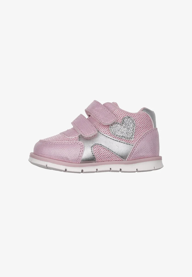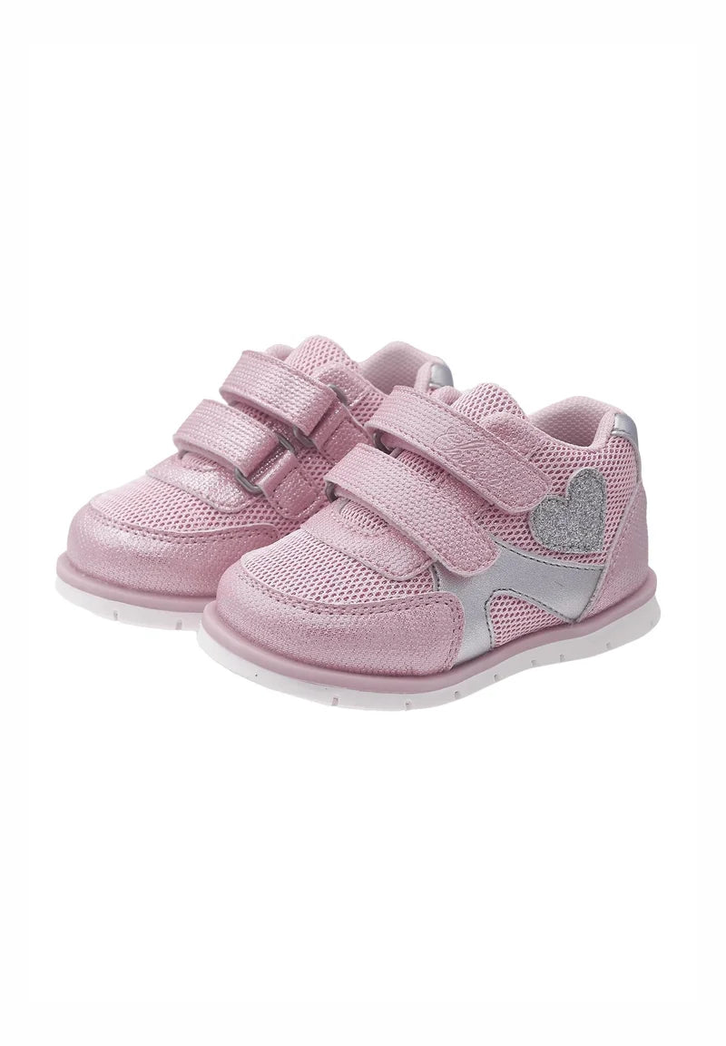 - Sneakers primi passi da bambina con inserto in tessuto tecnico glitter e decorazione laterale a cuore