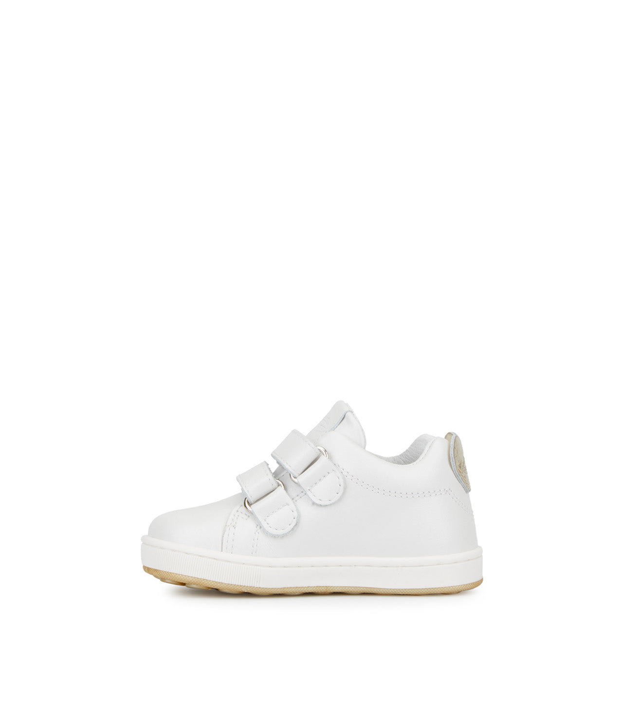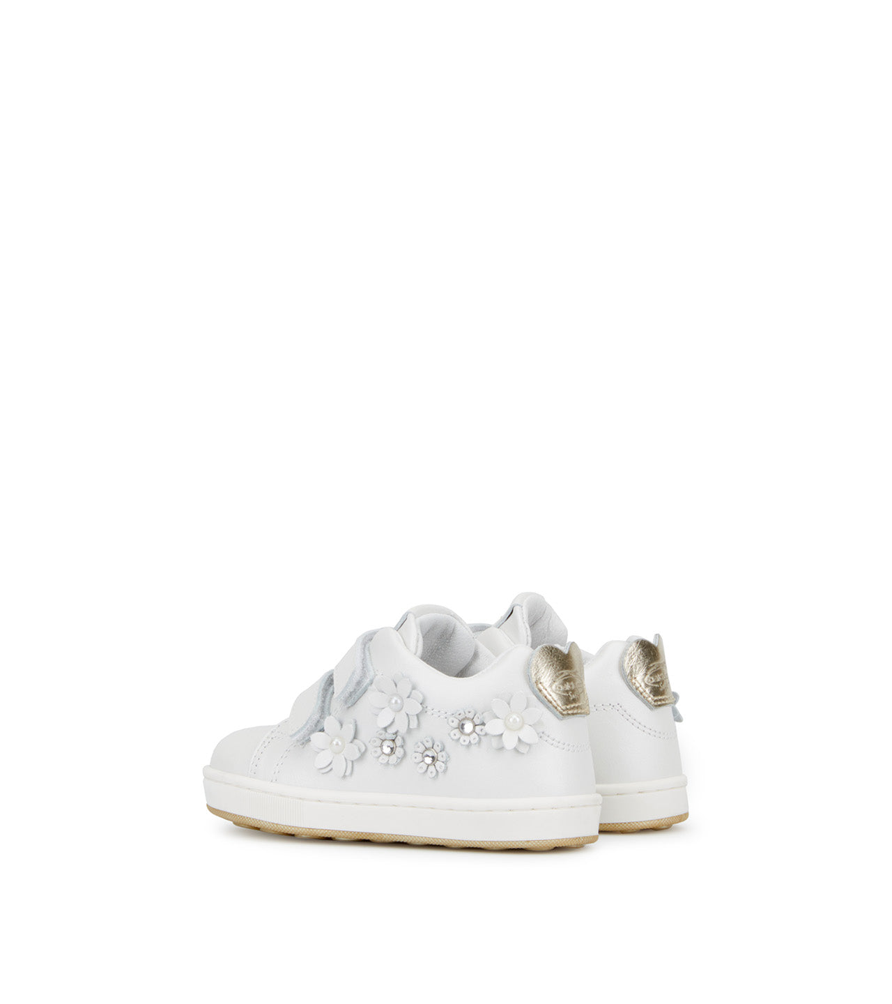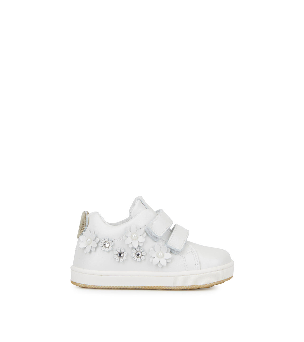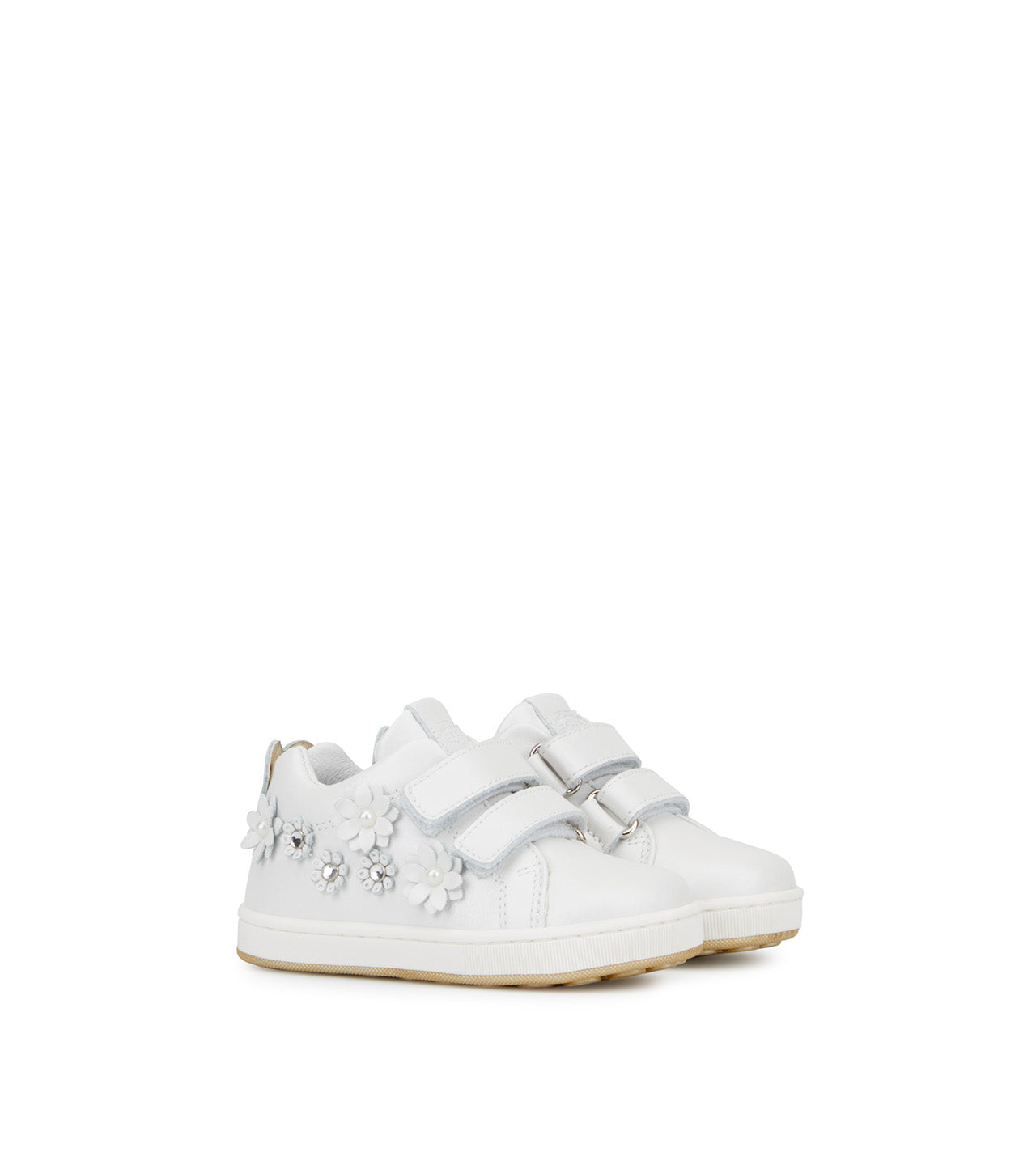 Romantica e delicata, questa sneaker in pelle bianca con dettagli dorati è impreziosita da applicazioni floreali tridimensionali. La doppia chiusura a strappo assicura una calzata pratica, mentre la suola flessibile accompagna ogni passo con leggerezza. Perfetta per un tocco di dolcezza quotidiana.