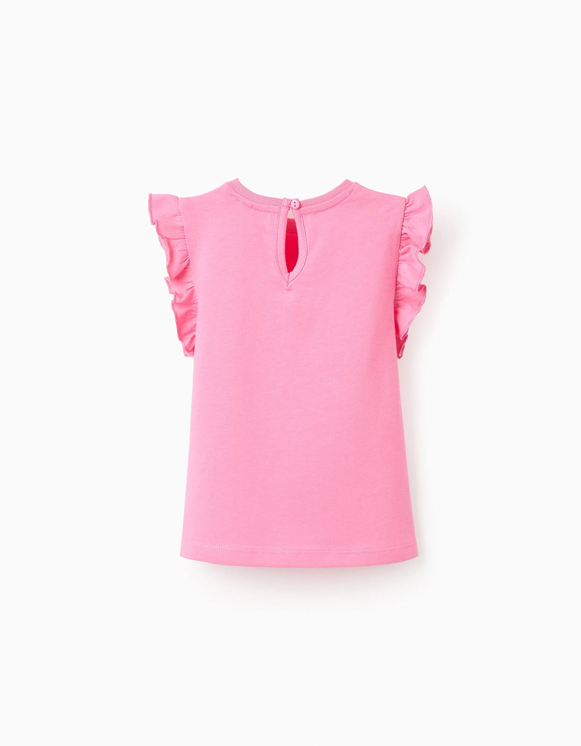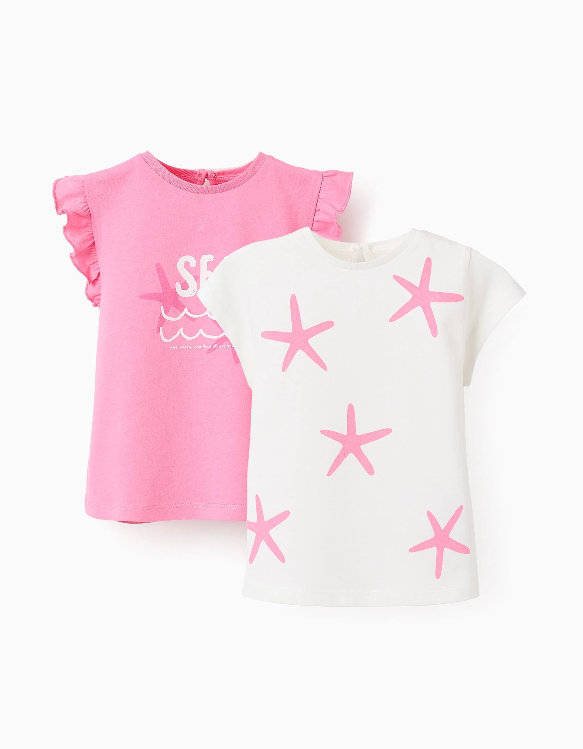 Confezione da due top per neonata, 100% cotone. Include un top rosa con stampa frontale e uno bianco con motivo. Balze sulle spalle. Etichette interne stampate per non irritare la pelle. Bottoni sul retro per una facile vestizione. Un'opzione leggera e comoda da abbinare ai colori estivi. We Care: articolo con certificazione Oeko-Tex Standard 100, che garantisce l'assenza di sostanze nocive o irritanti per la pelle.