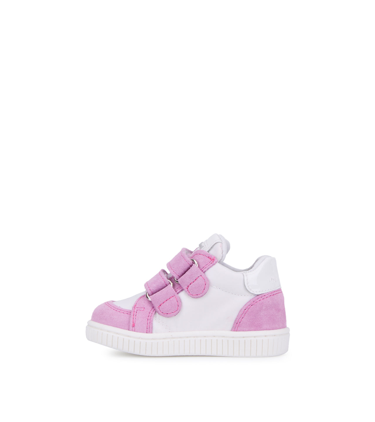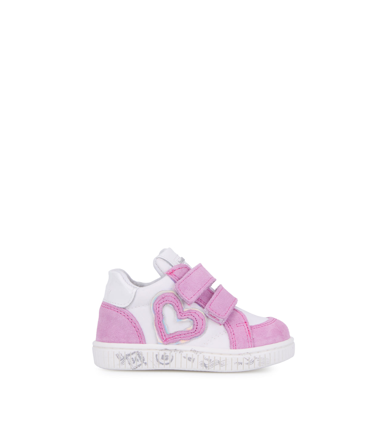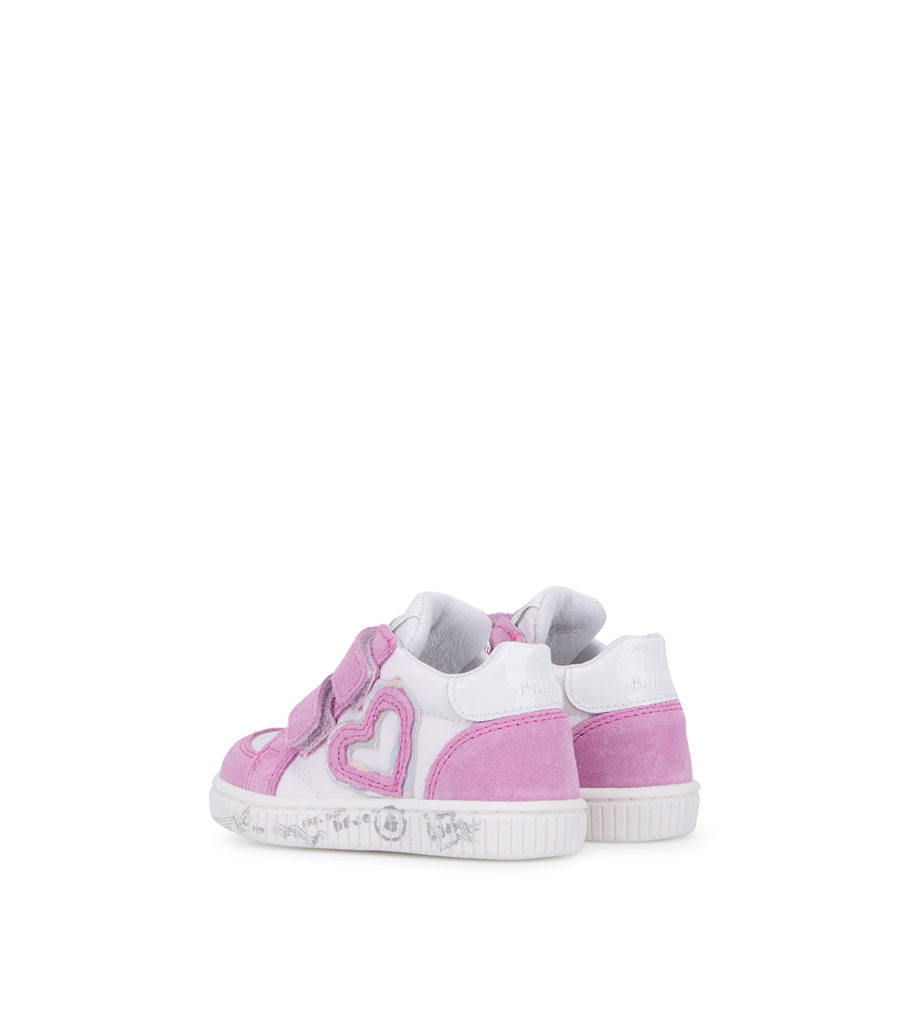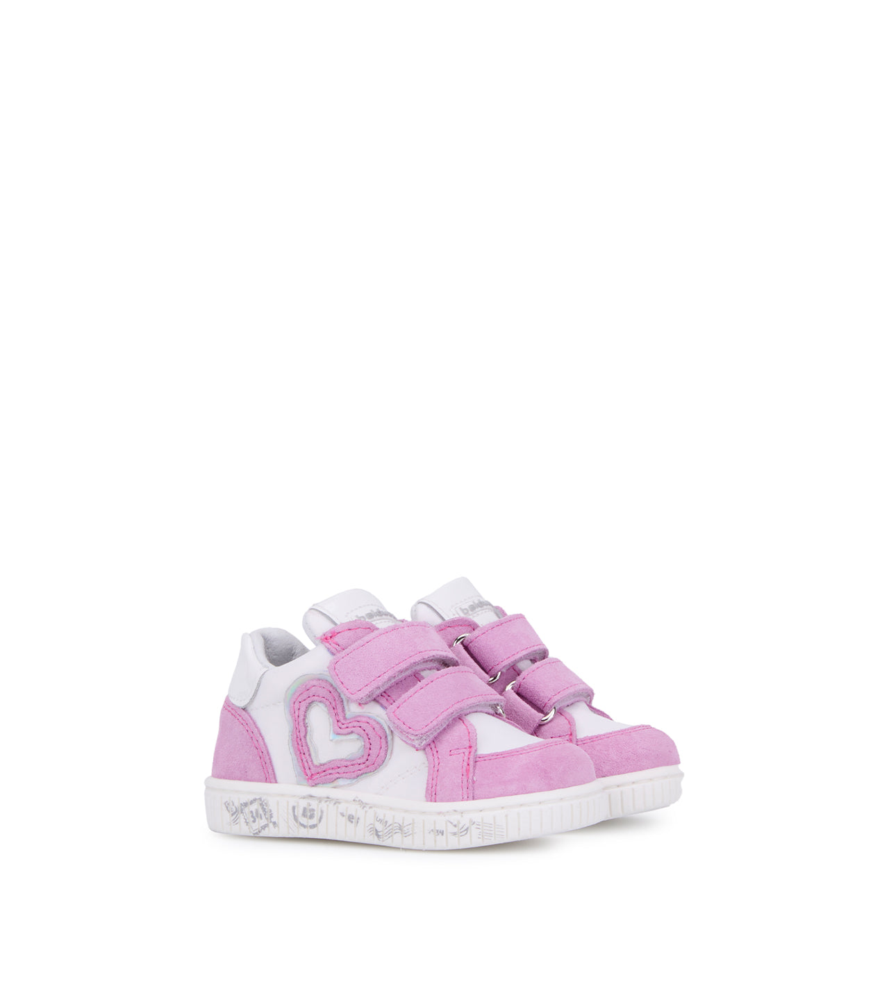 Un concentrato di dolcezza e allegria. La tomaia in pelle bianca e suede rosa è decorata da un maxi cuore applicato, mentre la suola è animata da simpatici disegni incisi. I doppi strappi rendono la calzata pratica e regolabile, perfetta per muoversi in libertà.