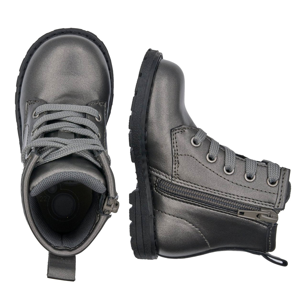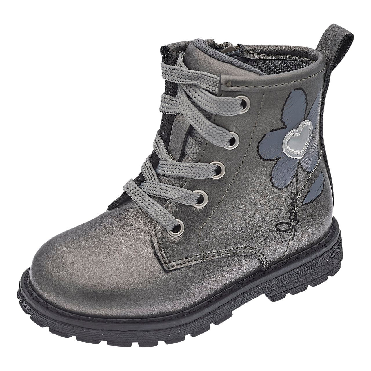 - Polacchino dal look grintoso in materiale laminato con fiore stampato e applicazione a cuore, regolabile con lacci e zip laterale