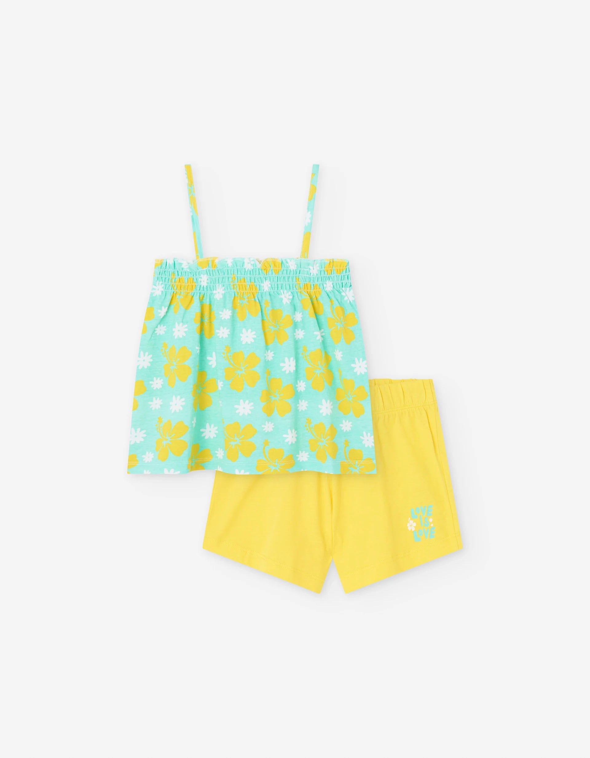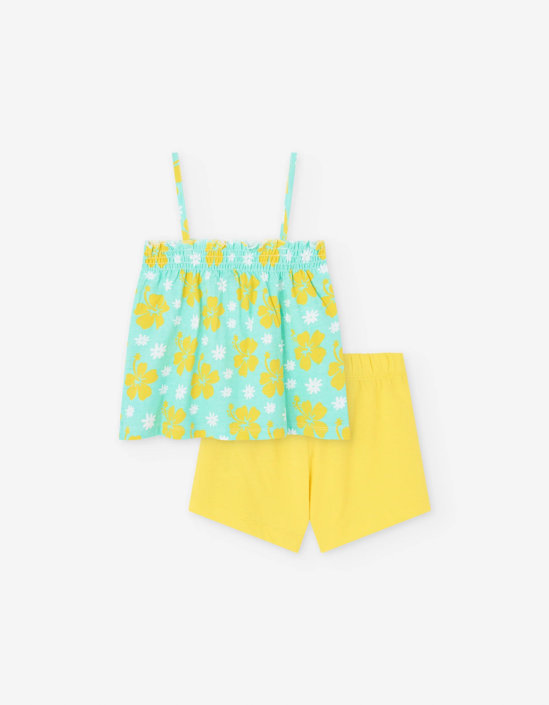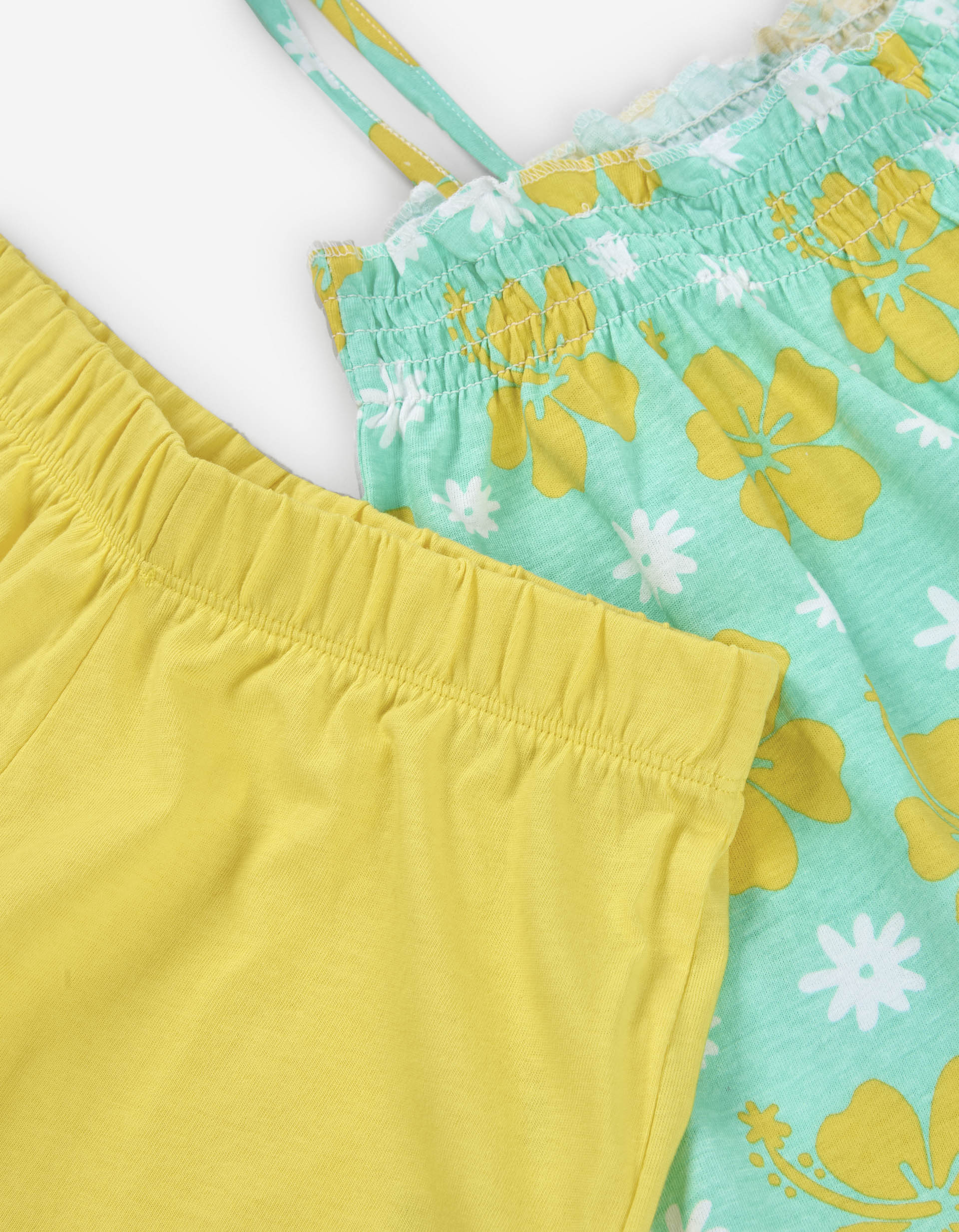 Completo due pezzi per bambine. Include un top verde a fiori con spalline sottili e pantaloncini gialli a tinta unita con dettagli stampati.