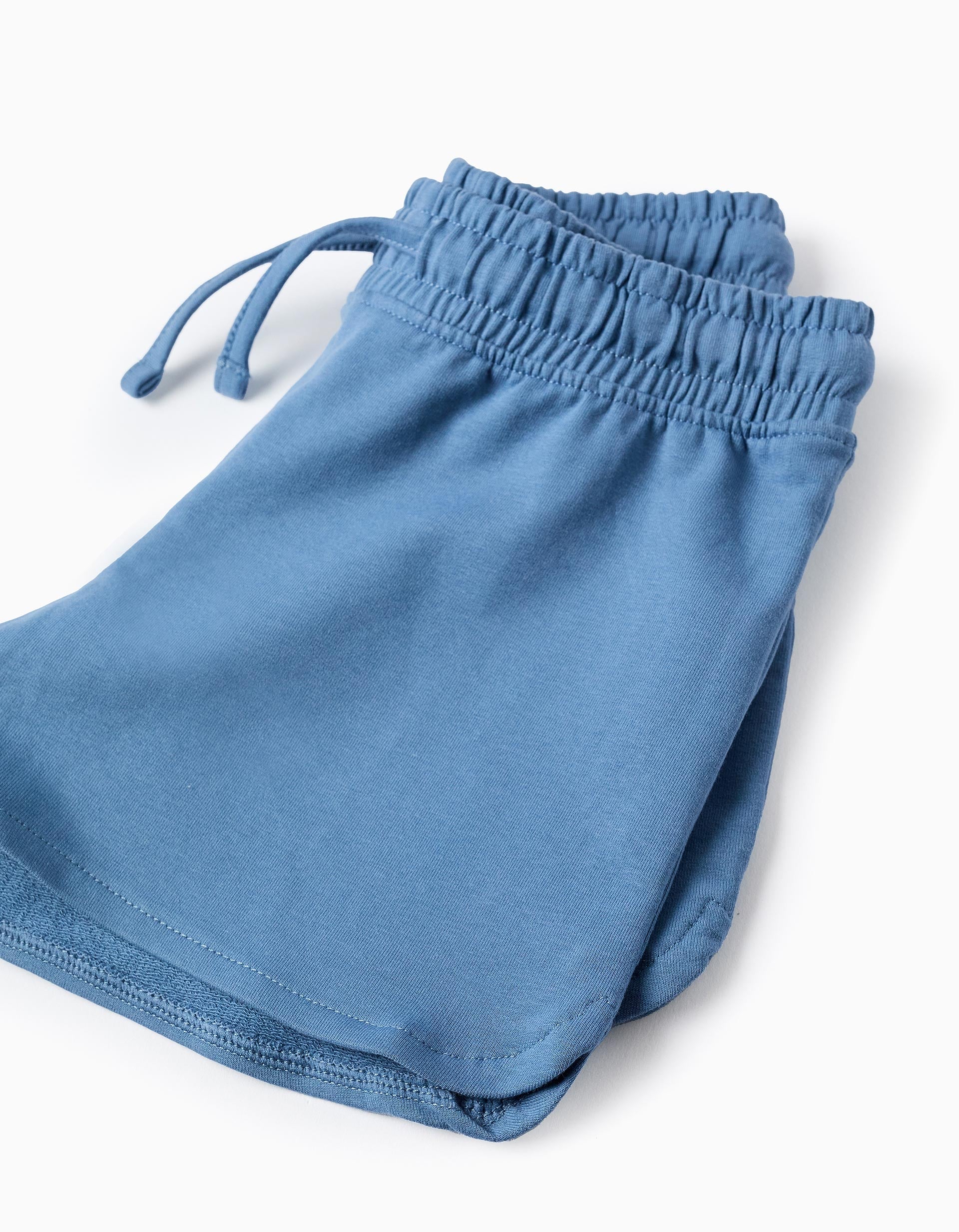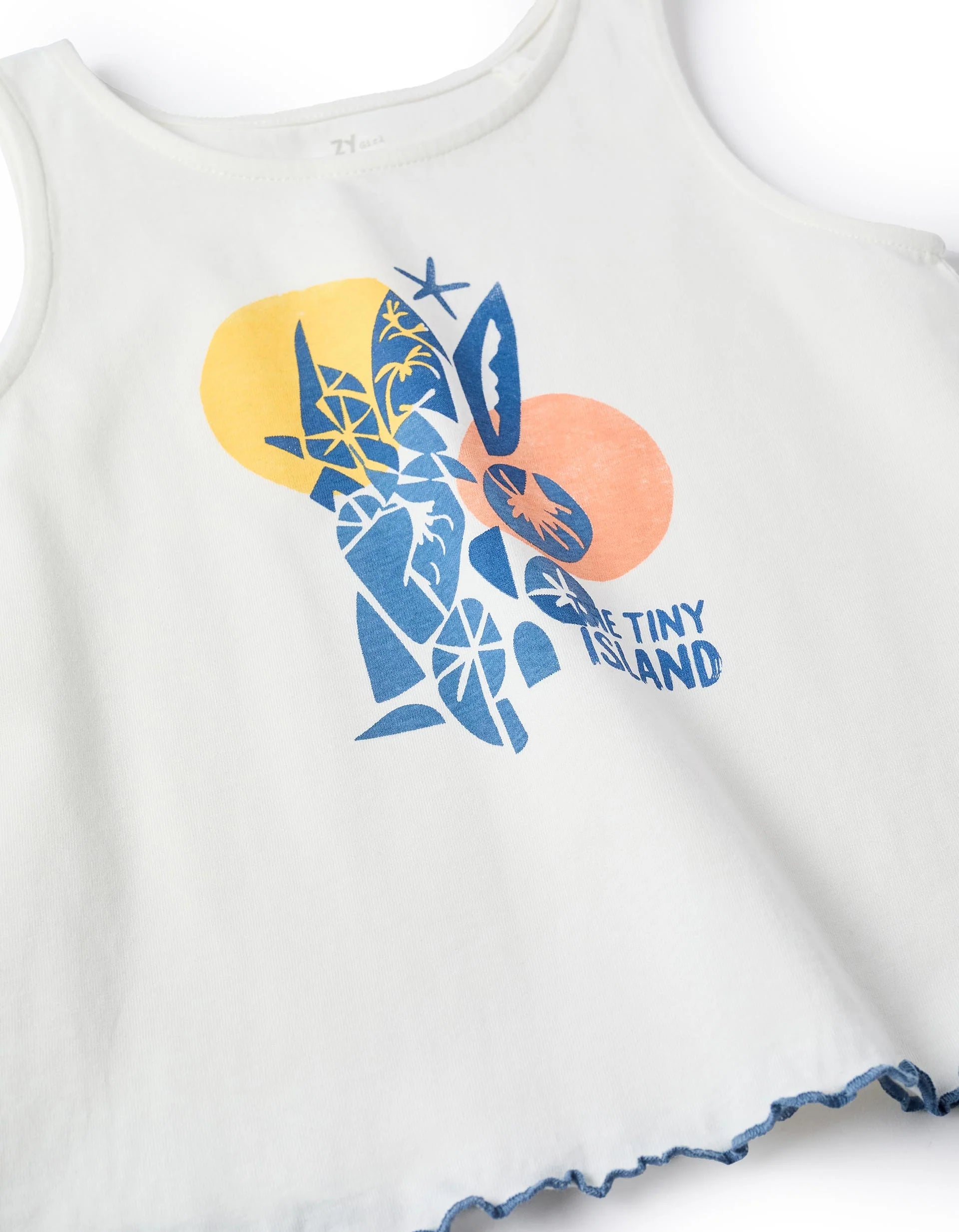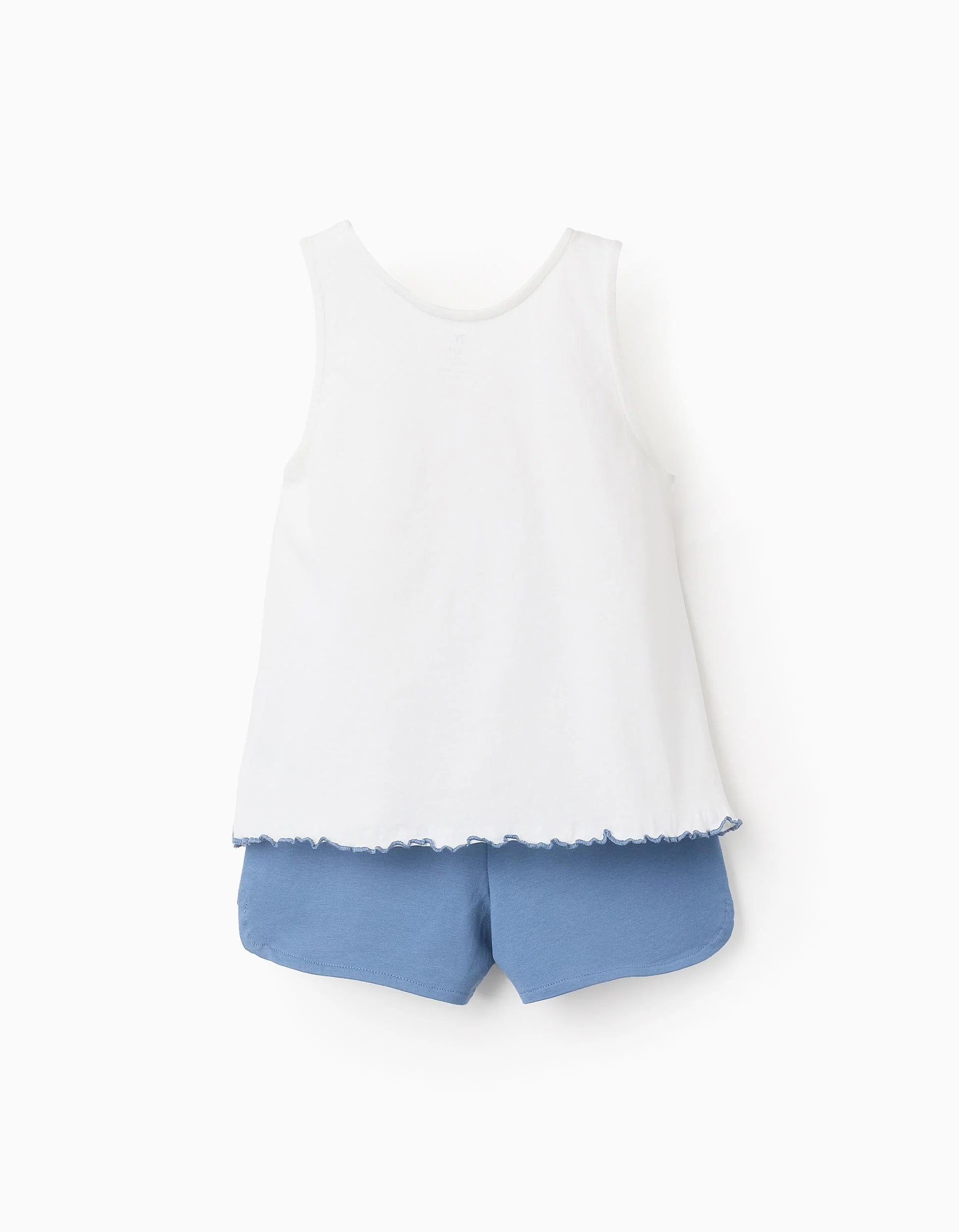 Completo due pezzi per bambine. È composto da una T-shirt bianca in 100% cotone con stampa frontale e base effetto ondulato; e pantaloncini blu semplici, con elastico in vita e coulisse. Etichetta interna stampata per evitare irritazioni alla pelle. Ideale per l'uso quotidiano!