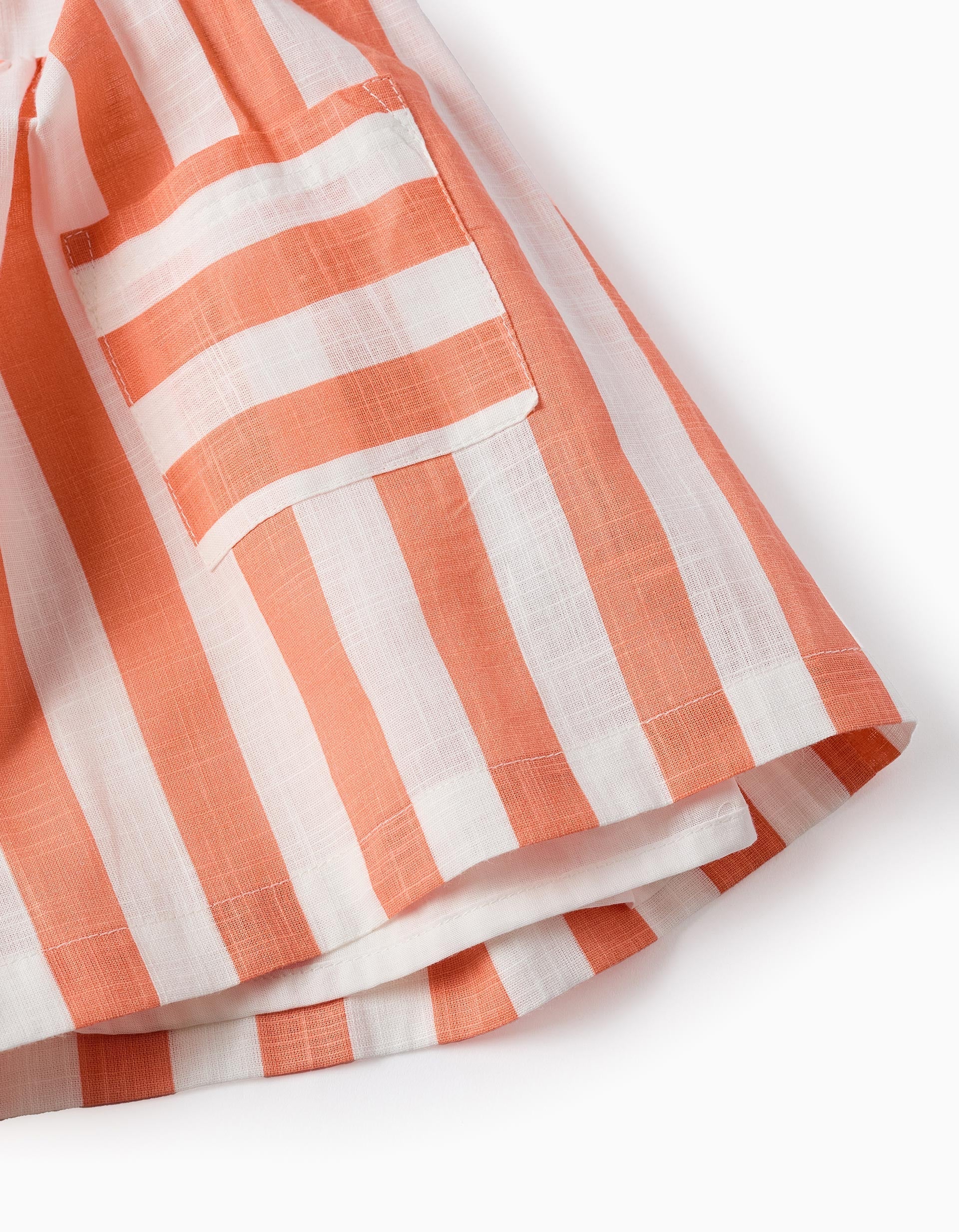 Vestito a righe bianco e arancione per neonate. Vita arricciata. Tasche anteriori. Colletto elastico. Elastici sul retro, per una vestibilità perfetta. Un capo leggero ed estivo!