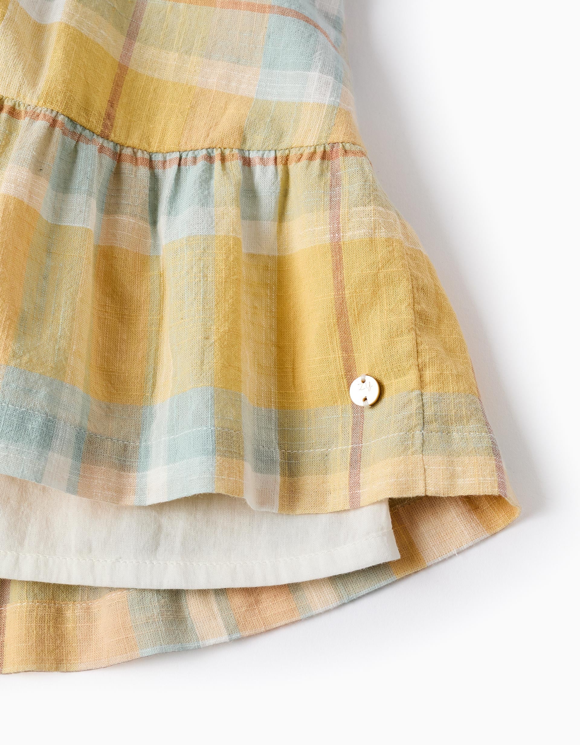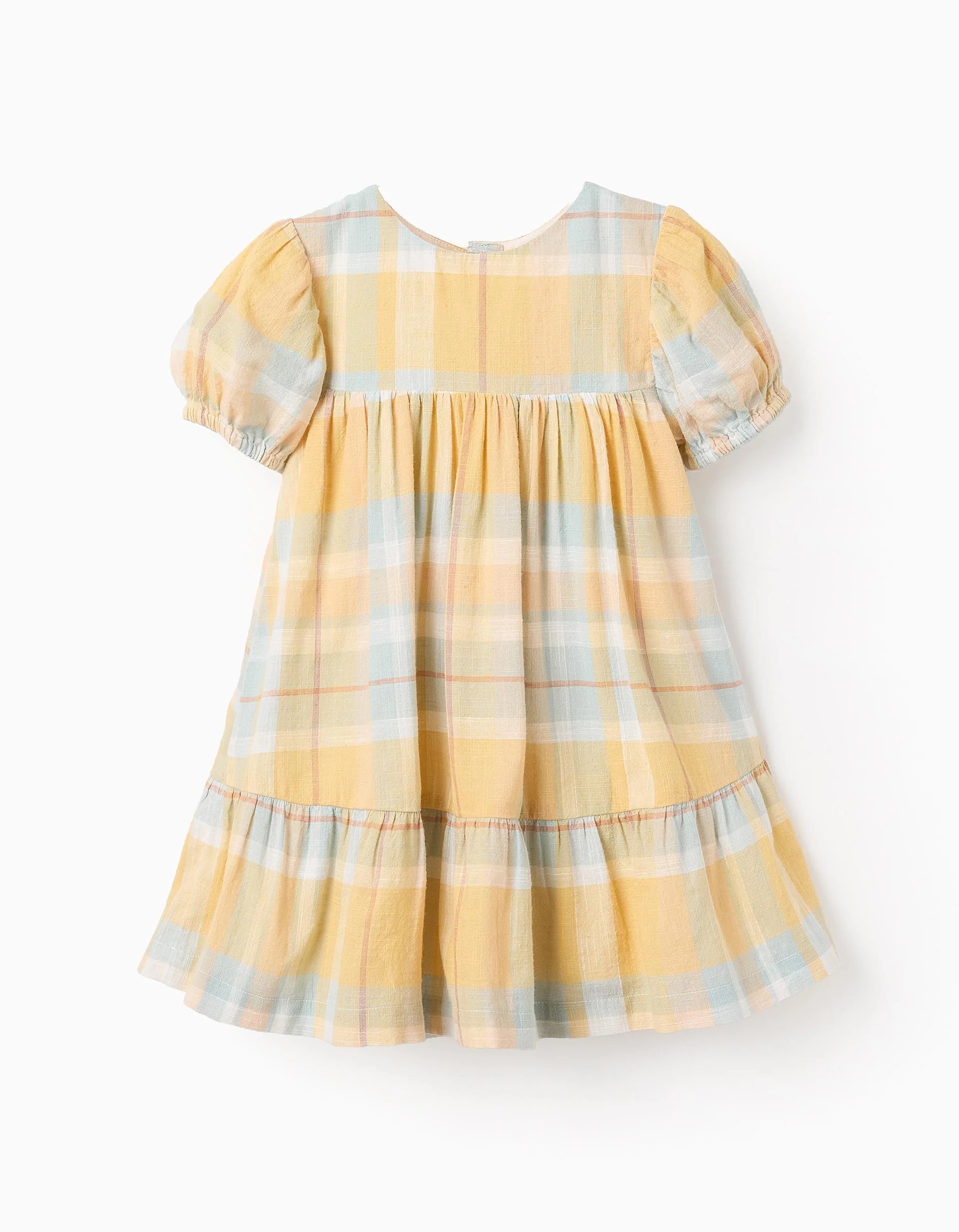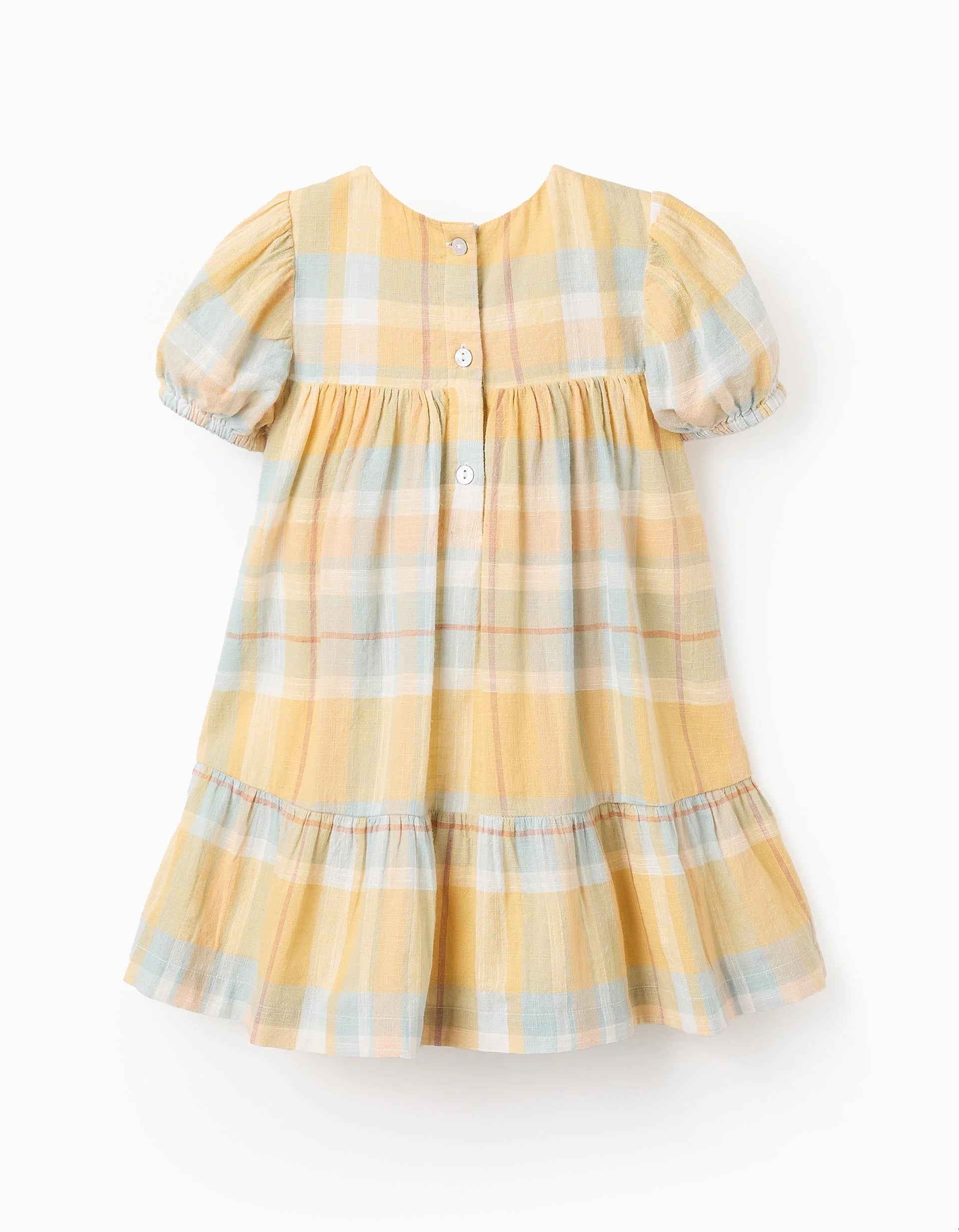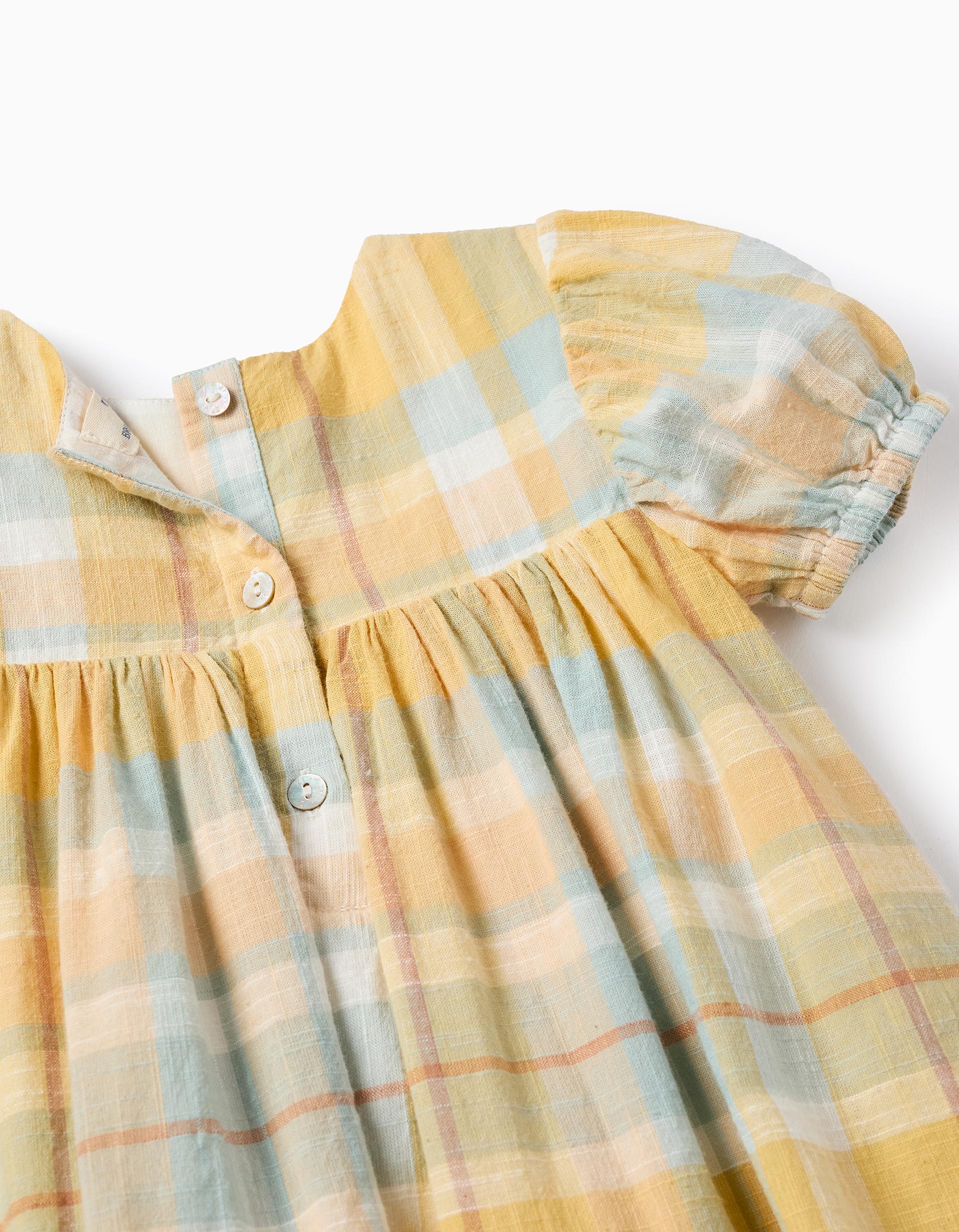 Vestito con motivo a quadri nei toni del giallo e dell'azzurro per neonate. 100% cotone. Maniche elastiche. Gonna con arricciature e volant. Bottoni sul retro per una facile vestizione. Con fodera