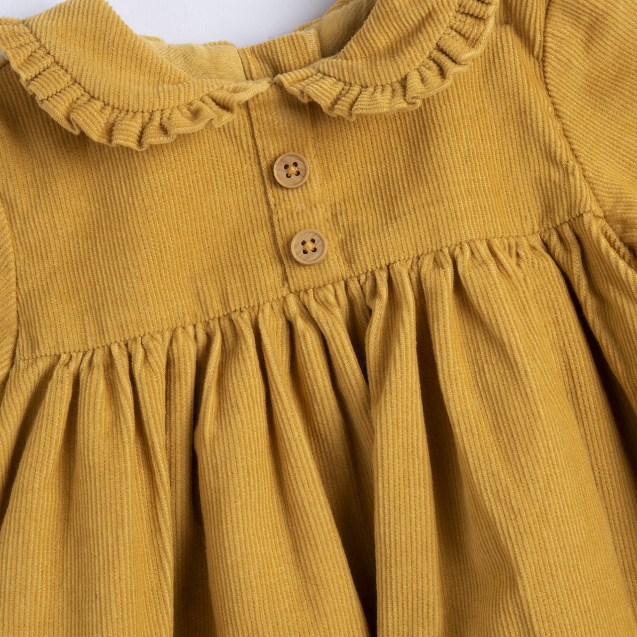 - Vestito manica lunga in velluto millerighe, collo baby con rouche