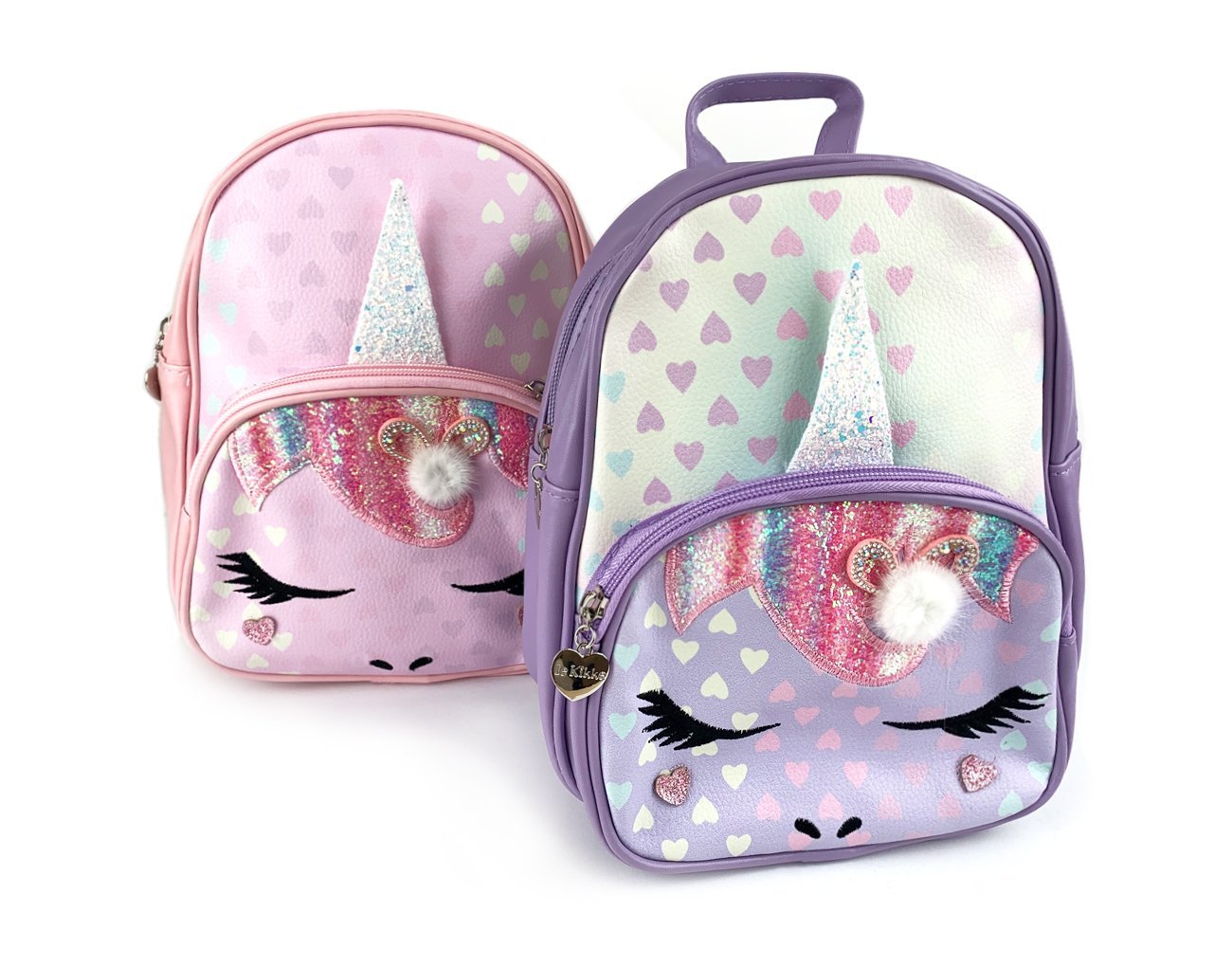 zainetto in ecopelle con applicazioni unicorno glitter e pon pon.